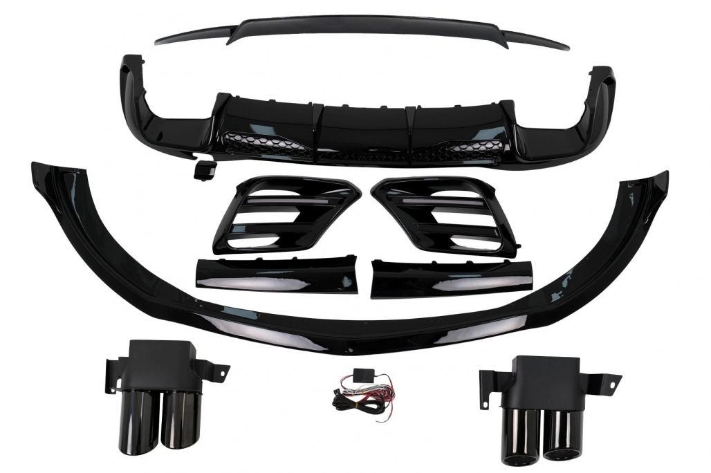 Pachet Exterior Aero Prelungire Bara Fata Fabricat din plastic de inalta calitate Culoare: Negru Lucios Grile Laterale Fabricate din plastic de inalta calitate Culoare: Negru Lucios Difuzor pentru bara spate Fabricat din plastic de inalta calitate Echipat cu ornamente de evacuare duble, capacul pentru carligul de remorcare, Ornamentele de evacuare sunt fabricate din otel de cea mai buna calitate Culoare: Negru Lucios Eleron Portbagaj Fabricat din plastic de inalta calitate Nevopsit