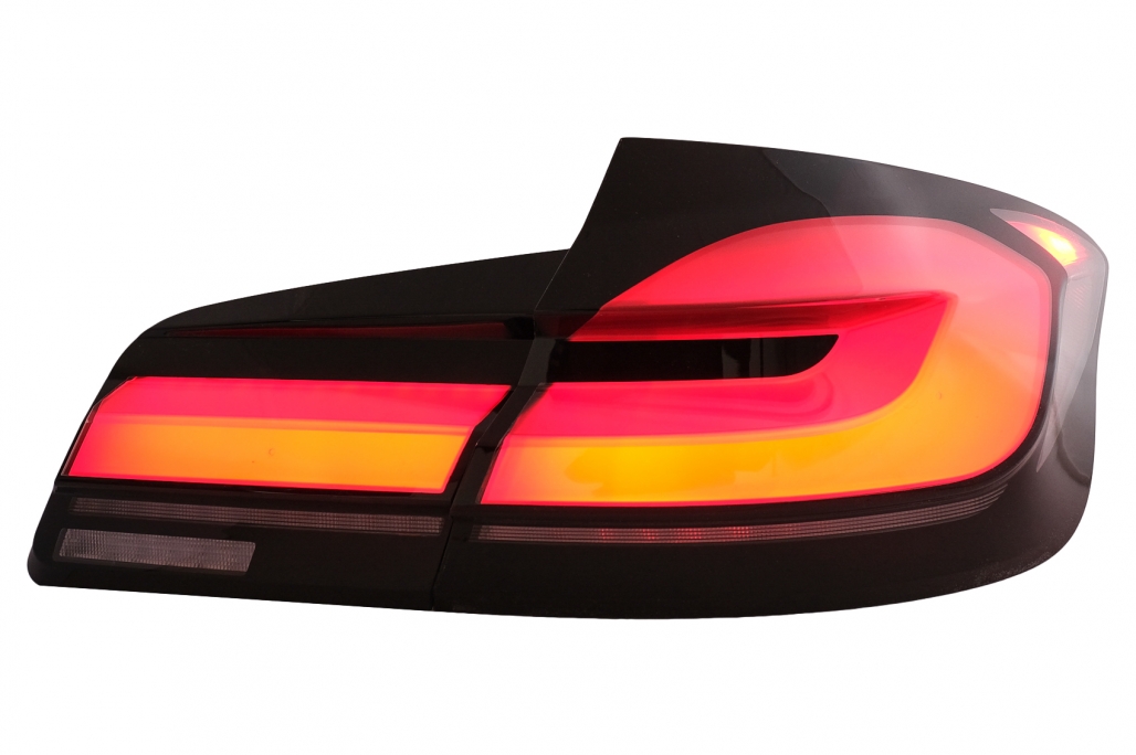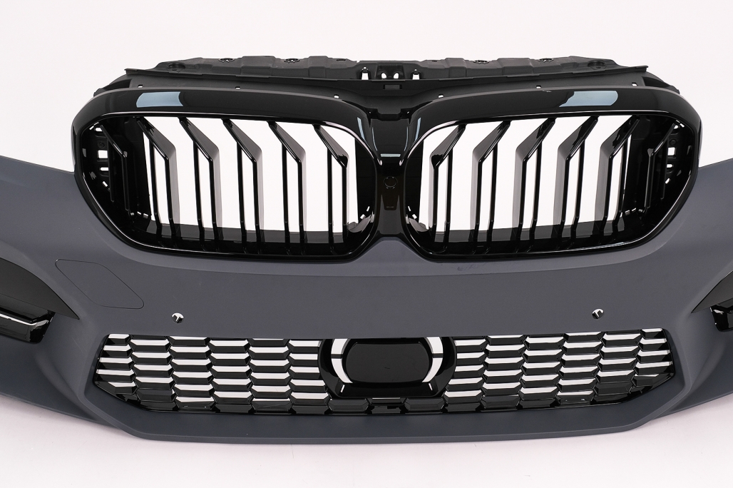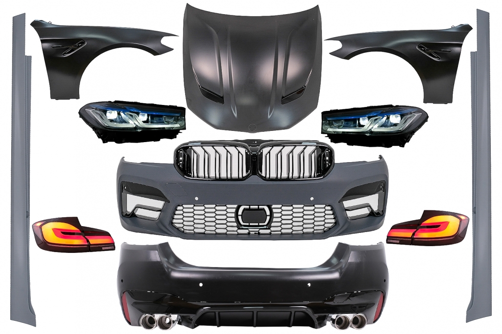 Kit exterior complet conversie la G30 LCI M5 Design fabricat din polipropilena de cea mai buna calitate. Bara fata echipata cu grila central inferioara, grile laterale, suporti pentru PDC Bara spate echipata cu difuzor cu evacuare dubla si elemente reflectorizante. Praguri laterale fabricate din polipropilena de cea mai buna calitate. Aripile fata sunt echipate cu orificii de ventilație laterale Capota este echipata cu ornamente de ventilație Capota este realizata din metal Faruri Full LED Culoare: negru, sticla transparenta Faza scurta: LED Faza lunga: LED Poziție: LED Semnal: LED Ornamente de evacuare Ornamentele de evacuare sunt realizate din oțel inoxidabil Stopuri cu LED cu Startup Display dinamic Culoare: Rosu/ Fumuriu Poziție: LED Semnal: LED dinamic Frana: LED Ceata: LED Marsarier: LED