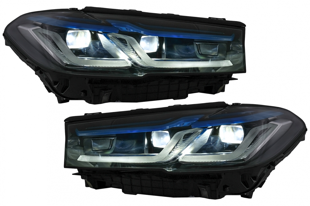 Kit exterior complet conversie la G30 LCI M5 Design fabricat din polipropilena de cea mai buna calitate. Bara fata echipata cu grila central inferioara, grile laterale, suporti pentru PDC Bara spate echipata cu difuzor cu evacuare dubla si elemente reflectorizante. Praguri laterale fabricate din polipropilena de cea mai buna calitate. Aripile fata sunt echipate cu orificii de ventilație laterale Capota este echipata cu ornamente de ventilație Capota este realizata din metal Faruri Full LED Culoare: negru, sticla transparenta Faza scurta: LED Faza lunga: LED Poziție: LED Semnal: LED Ornamente de evacuare Ornamentele de evacuare sunt realizate din oțel inoxidabil Stopuri cu LED cu Startup Display dinamic Culoare: Rosu/ Fumuriu Poziție: LED Semnal: LED dinamic Frana: LED Ceata: LED Marsarier: LED