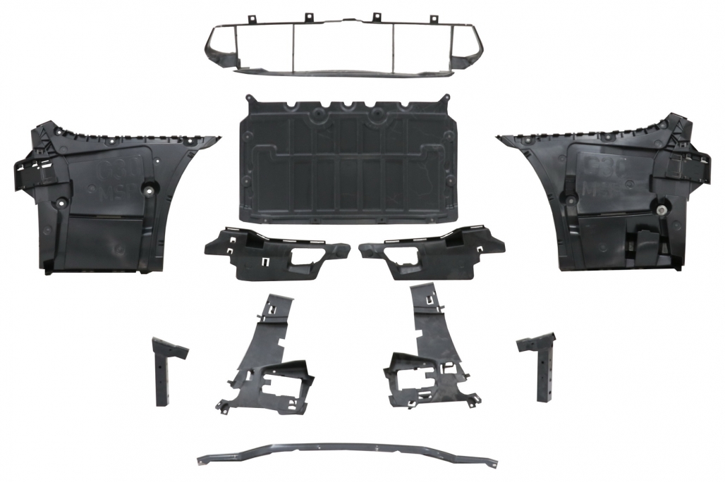 Bara fata este echipata cu grila centrala, grilele laterale, capacul de remorcare Bara fata nu este echipata cu senzorii de parcare (PDC) (Bara fata este insemnata cu semnele pentru PDC, dar daca aveti senzori de parcare va trebui sa dati gauri in aceasta pentru a monta senzorii de parcare) Bara fata nu este echipata cu capacelele pentru sistemul de spalare a farurilor (SRA). Nu sunt incluse anulatoare de proiecoare ceata. Fabricata din polipropilena de cea mai buna calitate si este pregatita pentru procesul de vopsire. Bara spate este echipata cu senzori de parcare (PDC) 6 senzori, difuzorul de aer si catadioptri. Fabricata din polipropilena de cea mai buna calitate si este pregatita pentru procesul de vopsire. Ornamentele sunt fabricate din otel inoxidabil 304 si fibra de carbon de cea mai buna calitate.