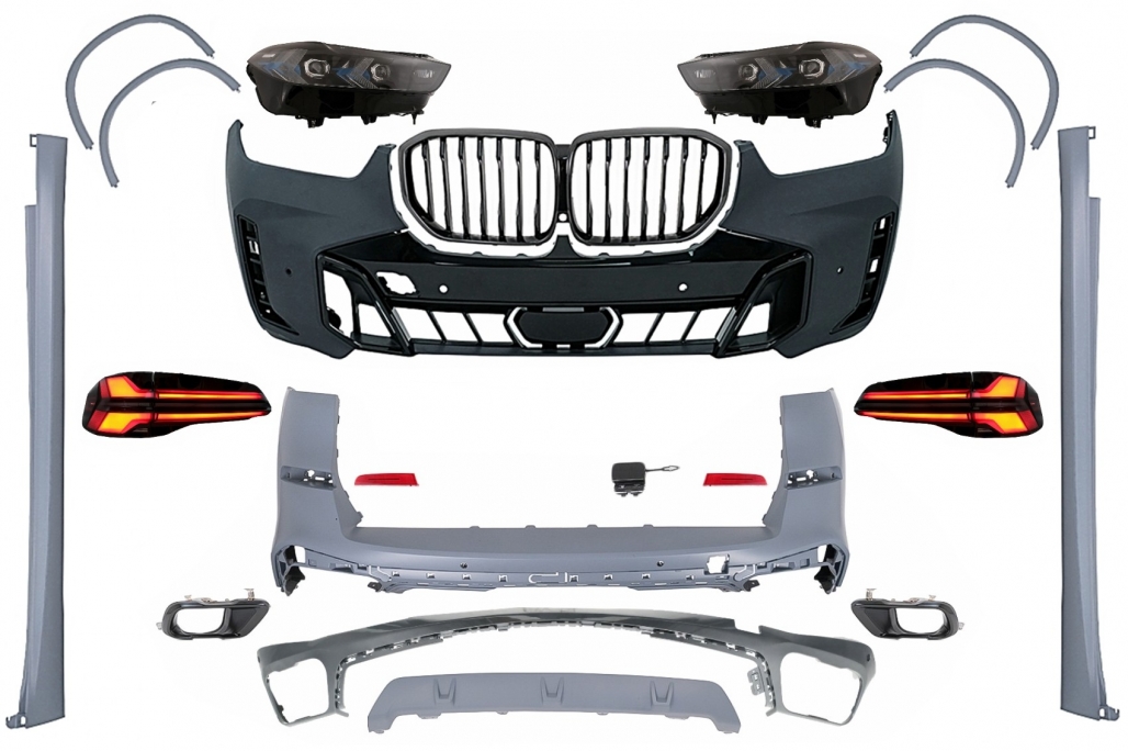 Acest kit caroserie BMW X5 G05 include elementele esențiale pentru o conversie vizuală completă: bară față, bară spate, faruri LED, stopuri LED, extensii de aripi și ornamente pentru evacuare. Componentele sunt realizate din materiale de calitate, rezistente și potrivite pentru un finisaj apropiat de designul facelift LCI 2023.