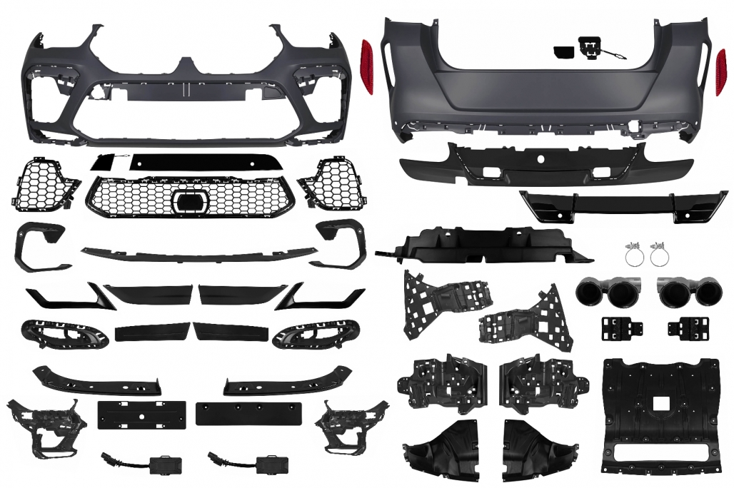 Pachet Exterior Bara fata echipata cu grila central Inferioara, grile laterale, suportii pentru PDC (senzori de parcare) si capacul pentru carligul de remorcare Bara Spate echipata cu suportii pentru PDC (senzori de parcare), capacul pentru carligul de remorcare si difuzorul detasabil pentru evacuare dubla. Bara fata, bara spate, sunt fabricate din polipropilena de cea mai buna calitate. Ornamente evacuare fabricate din otel inoxidabil. Extensii de aripi fabricate din polipropilena de cea mai buna calitate