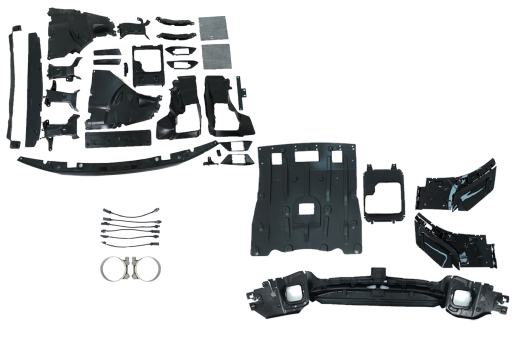 Pachet Exterior Bara fata echipata cu: Grile Central Inferioare Grile Laterale Suporti pentru PDC (senzori de parcare) Capac pentru carligul de remorcare Bara spate echipata cu: Suporti pentru PDC (senzori de parcare) Capac pentru carligul de remorcare Bara fata, bara spate, sunt fabricate din polipropilena de cea mai buna calitate. Extensii de aripi fabricate din polipropilena de cea mai buna calitate. Ornamente sistem de evacuare fabricate din otel inoxidabil. Culoare: Negru