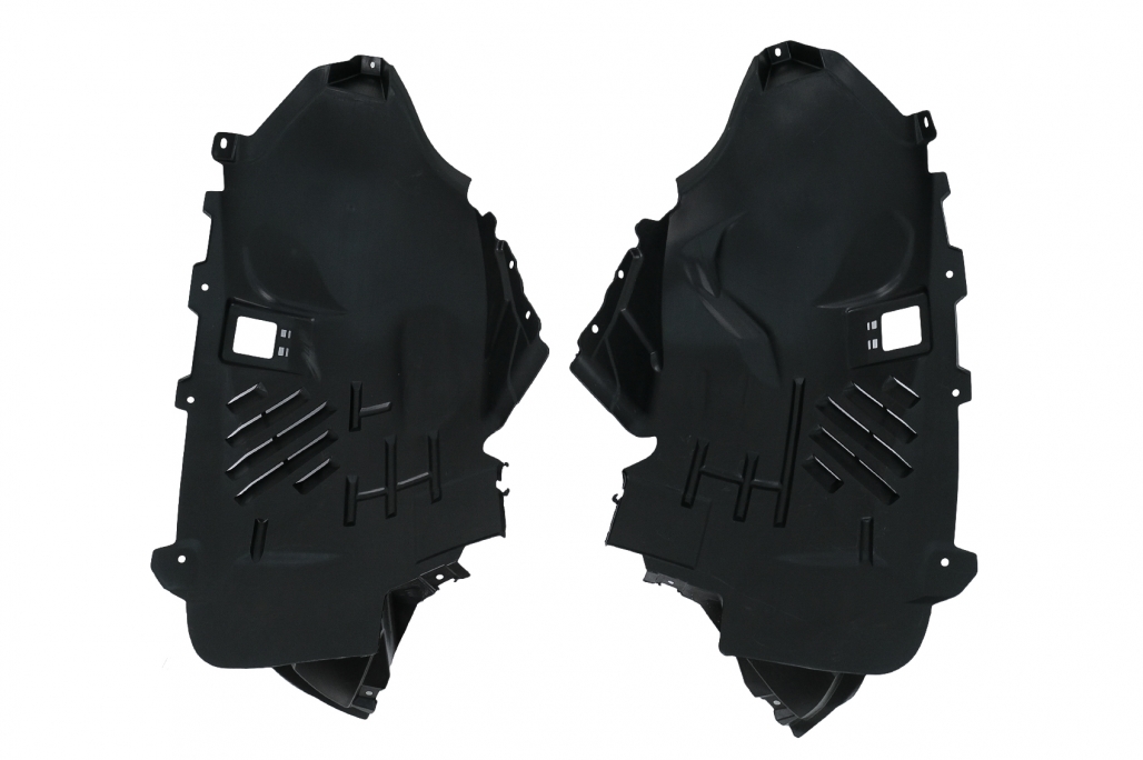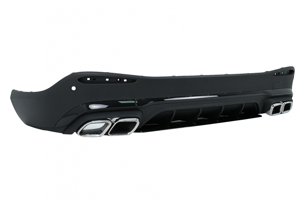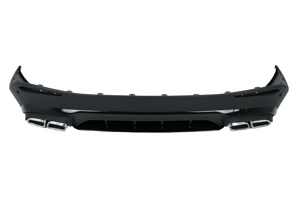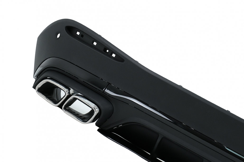 Pachet exterior complet Bara Fata echipata cu grila central-inferioara, grile laterale, suporti pentru camera, suporti pentru senzorii de parcare (PDC) si capacul carligului de remorcare. Ornamente pentru sistemul de evacuare Difuzor Bara Spate echipata cu difuzor de aer cu evacuare dubla, suporti pentru senzorii de parcare (PDC) si insertii negru lucios.
