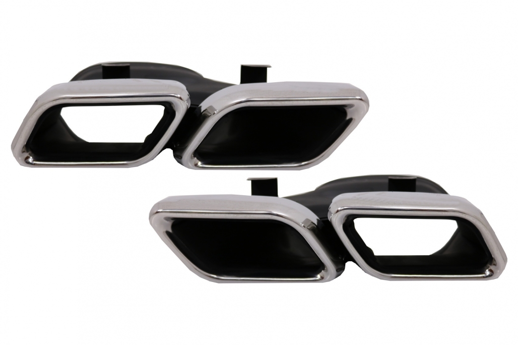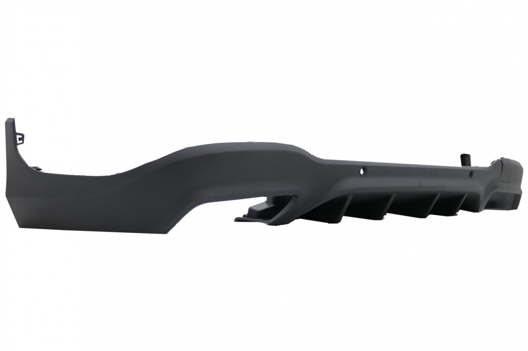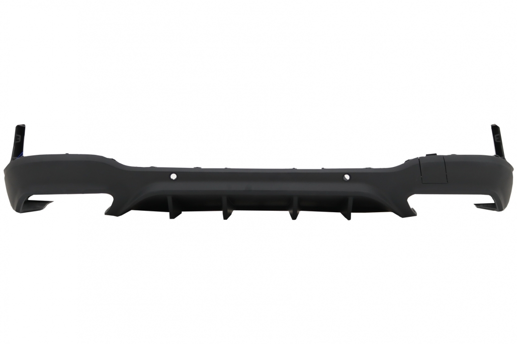 Pachet exterior complet Bara Fata echipata cu grila central-inferioara, grile laterale, suporti pentru camera, suporti pentru senzorii de parcare (PDC) si capacul carligului de remorcare. Ornamente pentru sistemul de evacuare Difuzor Bara Spate echipat cu evacuare dubla, suporti pentru senzorii de parcare (PDC).