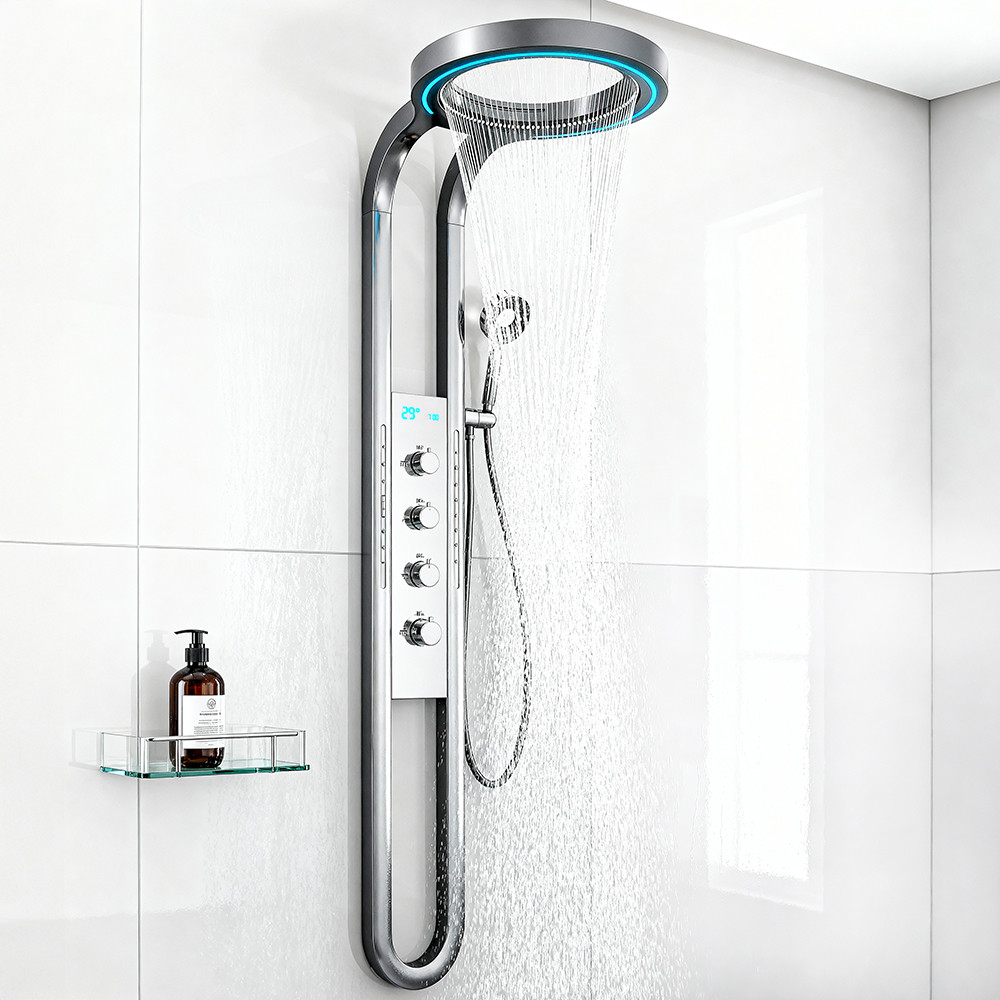 Selectează funcția dorită din comutatoarele dedicate: dușul superior pentru un duș rapid și confortabil, modul cascadă pentru un efect revigorant, sau jeturile de corp pentru un masaj plăcut după o zi lungă. Ajustează temperatura din levierul de control pentru o setare precisă și sigură.