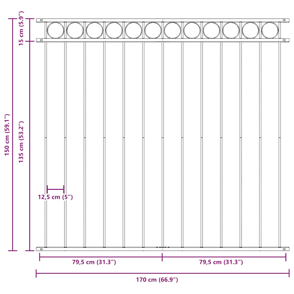 Panoul nostru de gard, cu un design simplu, dar practic și un vârf circular, se potrivește oricărei grădini, patio sau terasă. Acest panou este fabricat din oțel rezistent vopsit în câmp electrostatic, combinat cu stâlpi de gard (nu sunt incluși), ceea ce îl face o despărțire robustă și durabilă pentru grădina dvs.