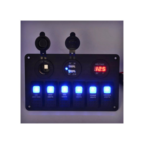 Organizează simplu alimentarea accesoriilor din vehicul cu acest panou întrerupătoare 12V tip SP10, ideal pentru mașină, off-road, autorulotă sau barcă. Ai la îndemână 6 comenzi iluminate, un voltmetru pentru monitorizarea bateriei, plus USB și priză 12V pentru încărcare rapidă.