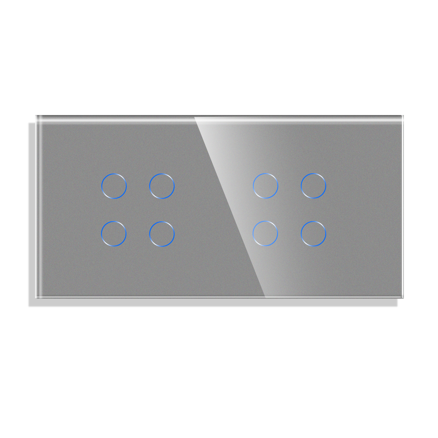 Panou intrerupator tactil cvadruplu + cvadruplu din sticla LUXION, compatibil cu modulele Luxion. Produsele LUXION se caracterizeaza printr-un design compact, elegant si minimalist. Sunt practice, realizate din materiale de calitate si durabile si ofera utilizare si confort casei tale.