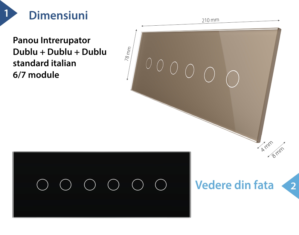 Panou Intrerupator Dublu + Dublu + Dublu cu Touch LIVOLO din Sticla, Standard Italian - 6/7M SmartElectro IntelligentHouse