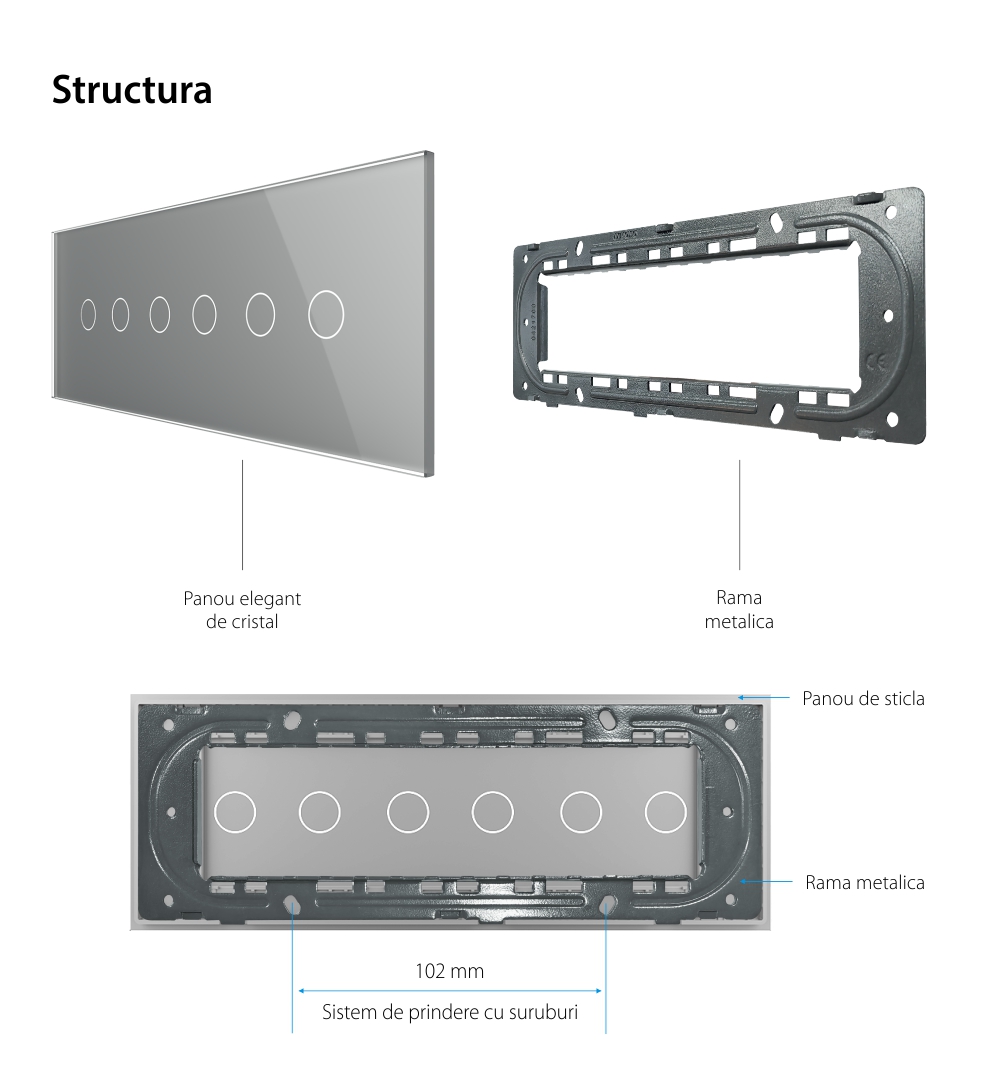 Panou Intrerupator Dublu + Dublu + Dublu cu Touch LIVOLO din Sticla, Standard Italian - 6/7M SmartElectro IntelligentHouse
