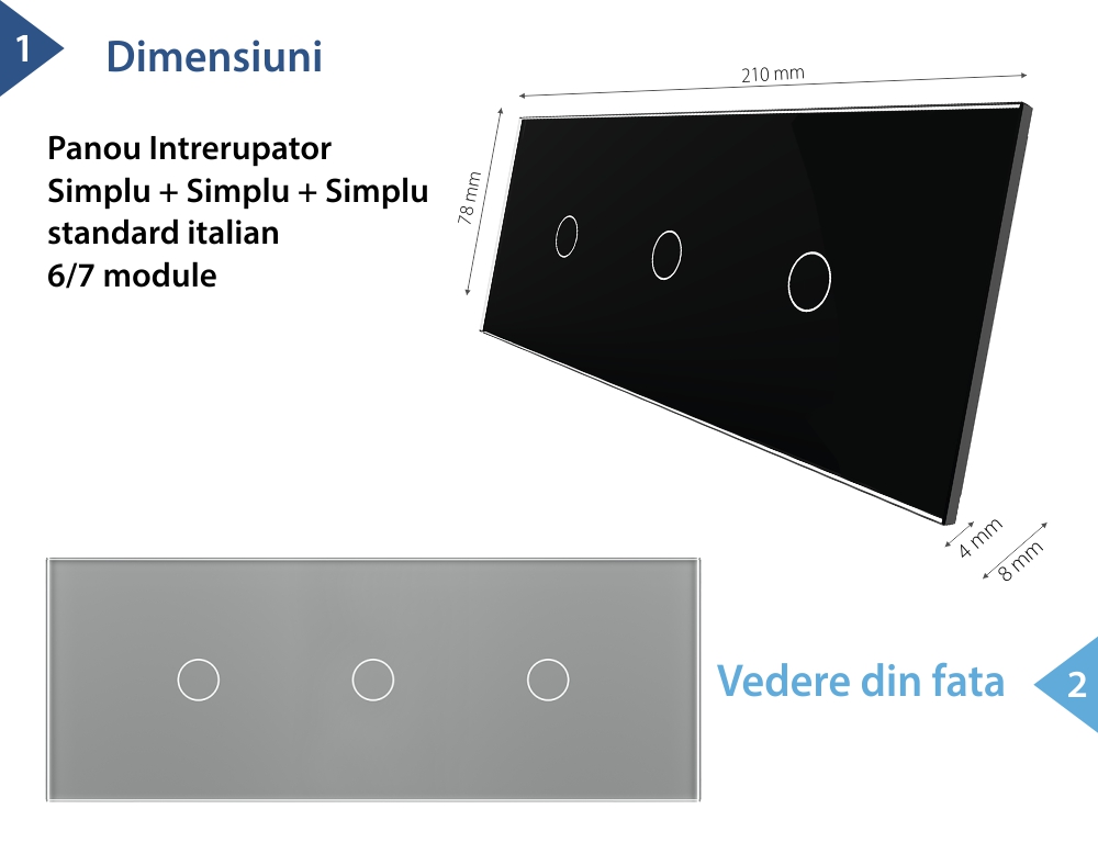 Panou intrerupator cu touch Livolo din sticla, standard italian, cu 6/7 module, din sticla crystal securizata, termorezistenta, compatibil doar cu modulele Livolo. Este rezistent la zgarieturi, umezeala, praf si ofera casei tale un plus de eleganta si rafinament.