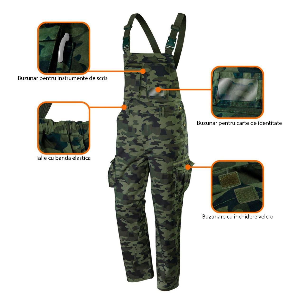 Descriere Pantaloni lucru pieptar, salopeta, camuflaj, model