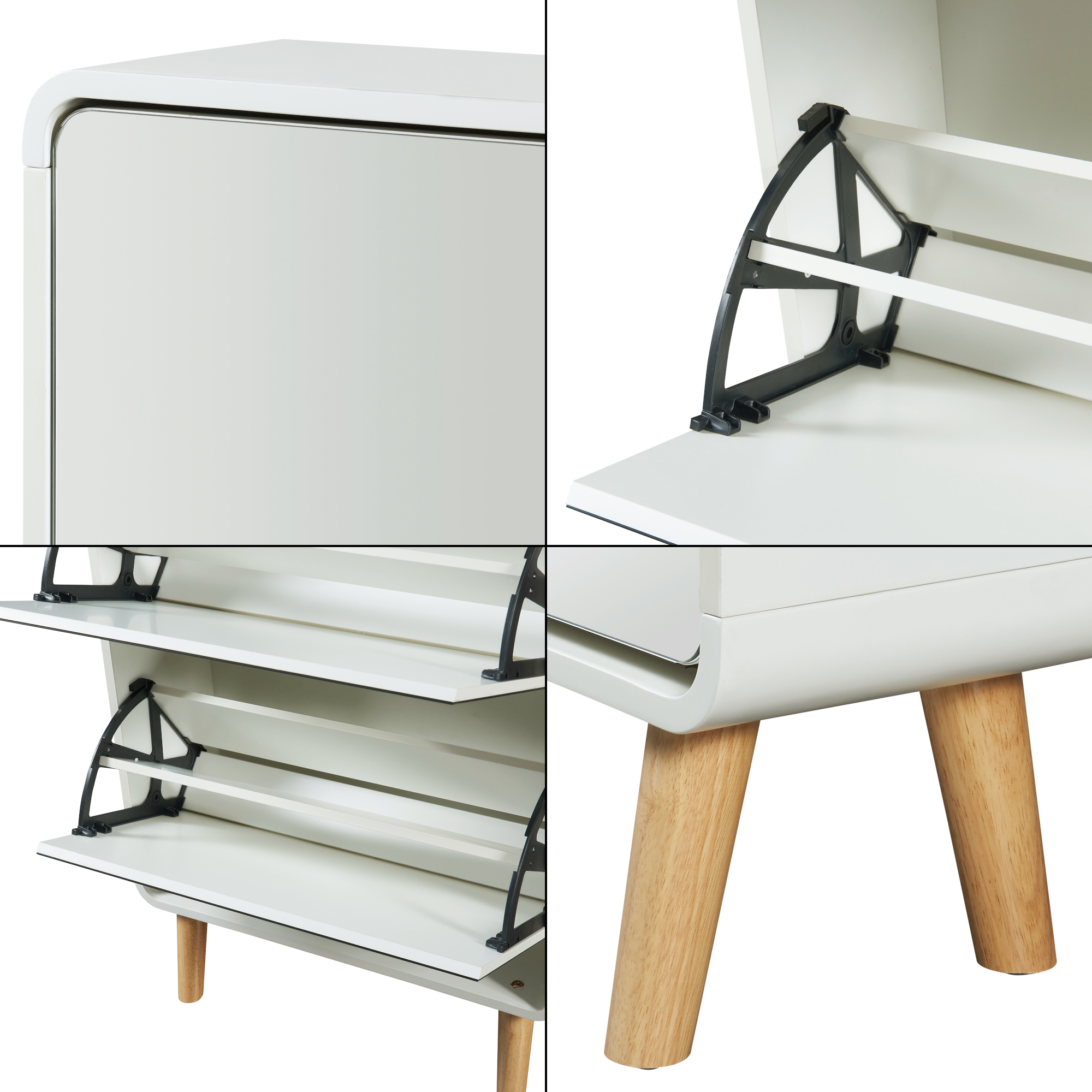 Partea superioară poate fi folosită ca poliță pentru accesorii, perfectă pentru chei, scrisori, ochelari de soare sau obiecte decorative. Datorită formei înguste, acest pantofar cu oglindă se potrivește foarte bine în holuri, vestibuluri sau spații mai restrânse.