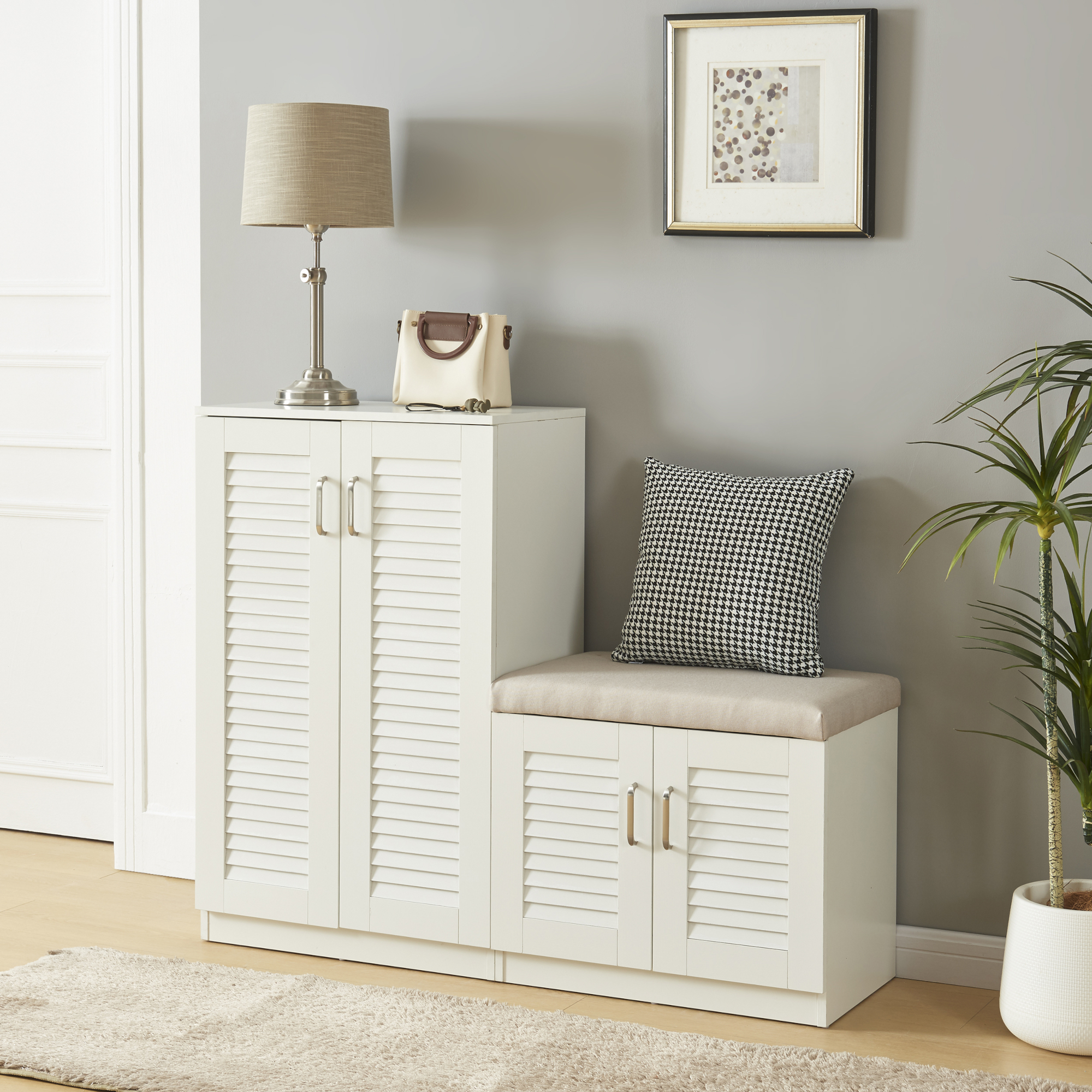 Poate fi folosit ca dulap pentru pantofi în hol, dar și ca soluție practică de depozitare în dormitor sau dressing. Banca laterală este utilă pentru încălțare confortabilă, iar partea superioară poate fi completată decorativ cu o lampă, geantă sau alte accesorii de interior.