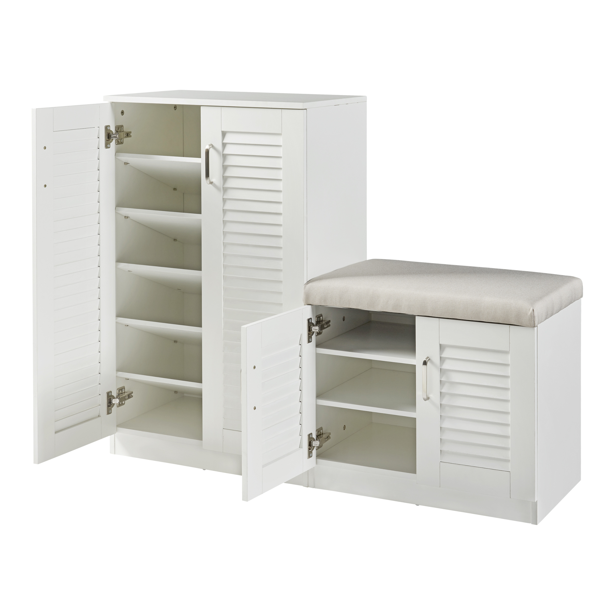 În interior, dulapul dispune de 9 rafturi care permit depozitarea ordonată a până la 18 perechi de pantofi. Cele 4 uși cu design aerisit contribuie la o mai bună ventilație, ajutând la menținerea prospețimii încălțămintei și la reducerea mirosurilor neplăcute. Banca integrată face încălțarea și descălțarea mult mai comodă, fiind perfectă pentru utilizare zilnică.