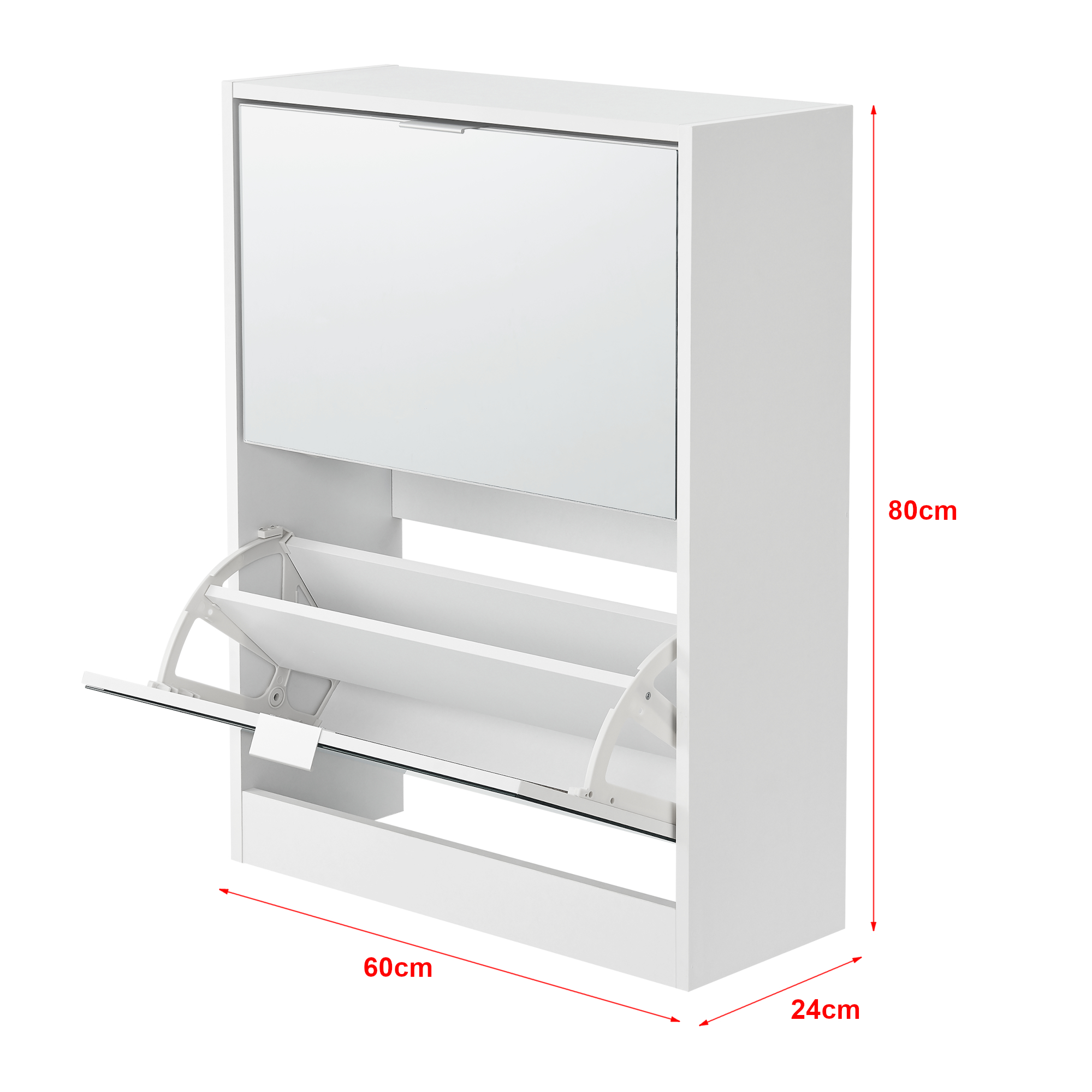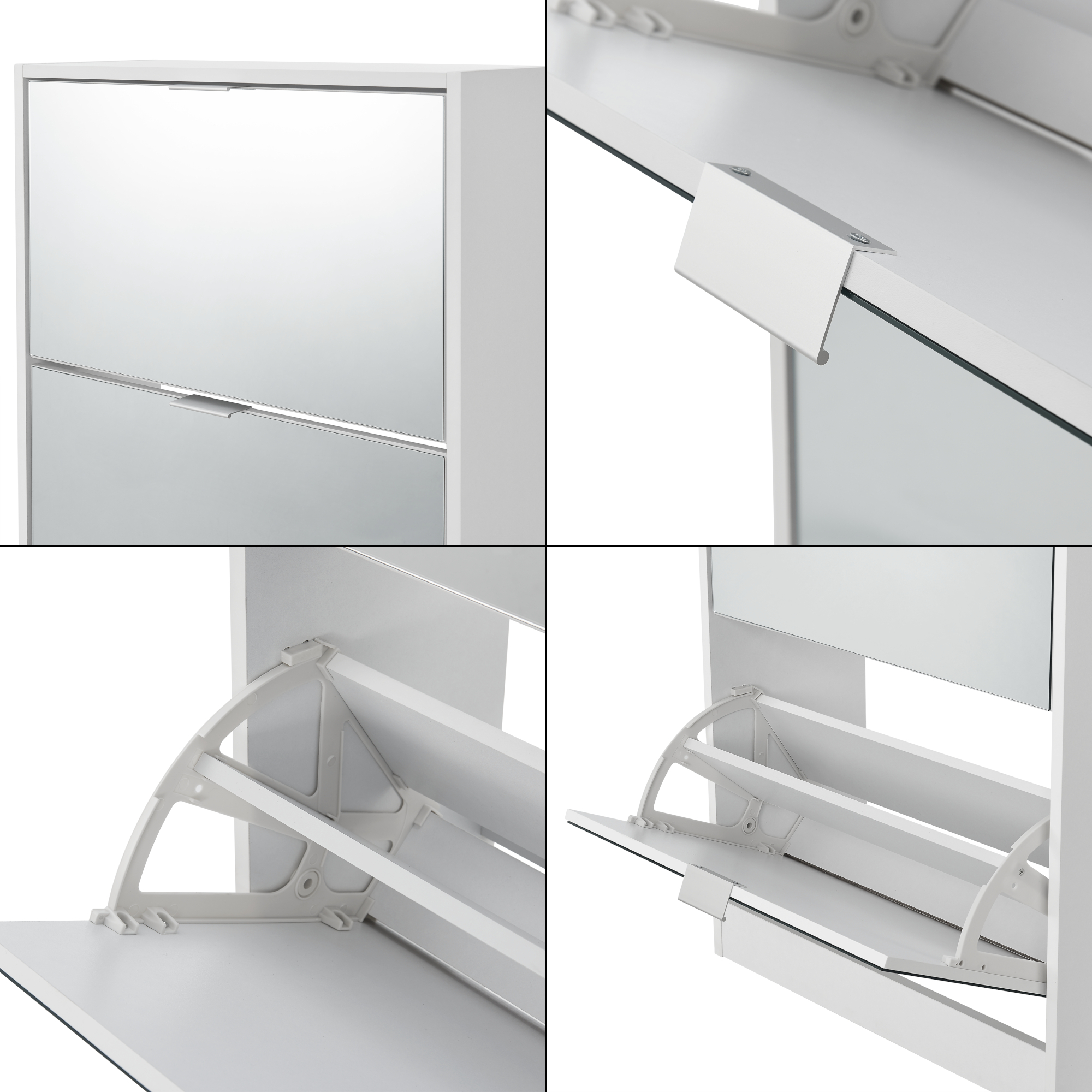 Prevăzut cu 2 uși rabatabile și o față frontală cu oglindă, dulapul pentru pantofi oferă un aspect elegant și luminos, contribuind vizual la mărirea spațiului. În plus, oglinda este practică pentru o ultimă verificare a ținutei înainte de plecare.