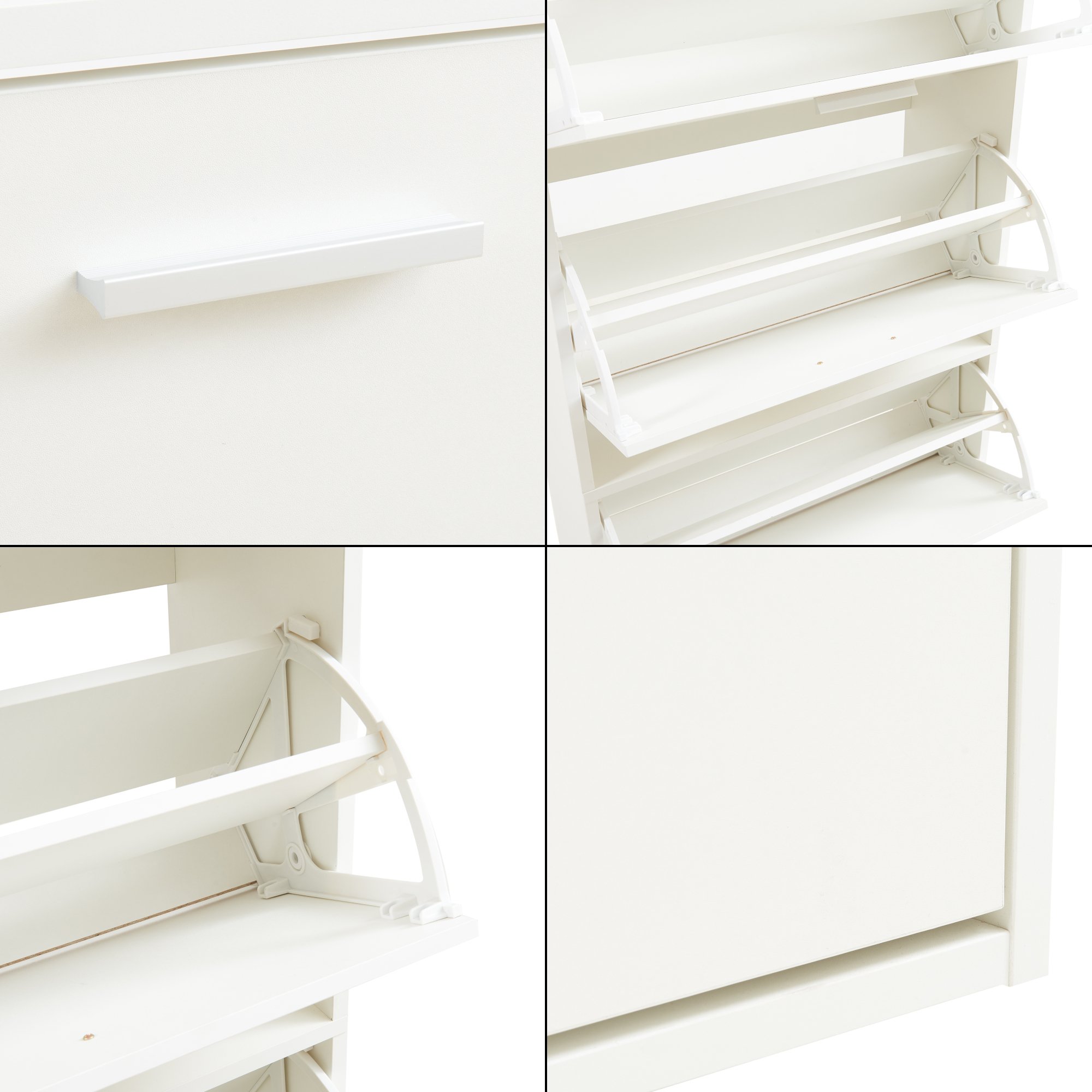 Cele 4 clapete se deschid separat, iar fiecare compartiment este impartit in doua zone pentru o aranjare mai clara a perechilor de pantofi, sneakersi, sandale sau incaltaminte sport. Pentru articole mai voluminoase, precum ghete sau bocanci, politele interioare pot fi scoase cu usurinta.