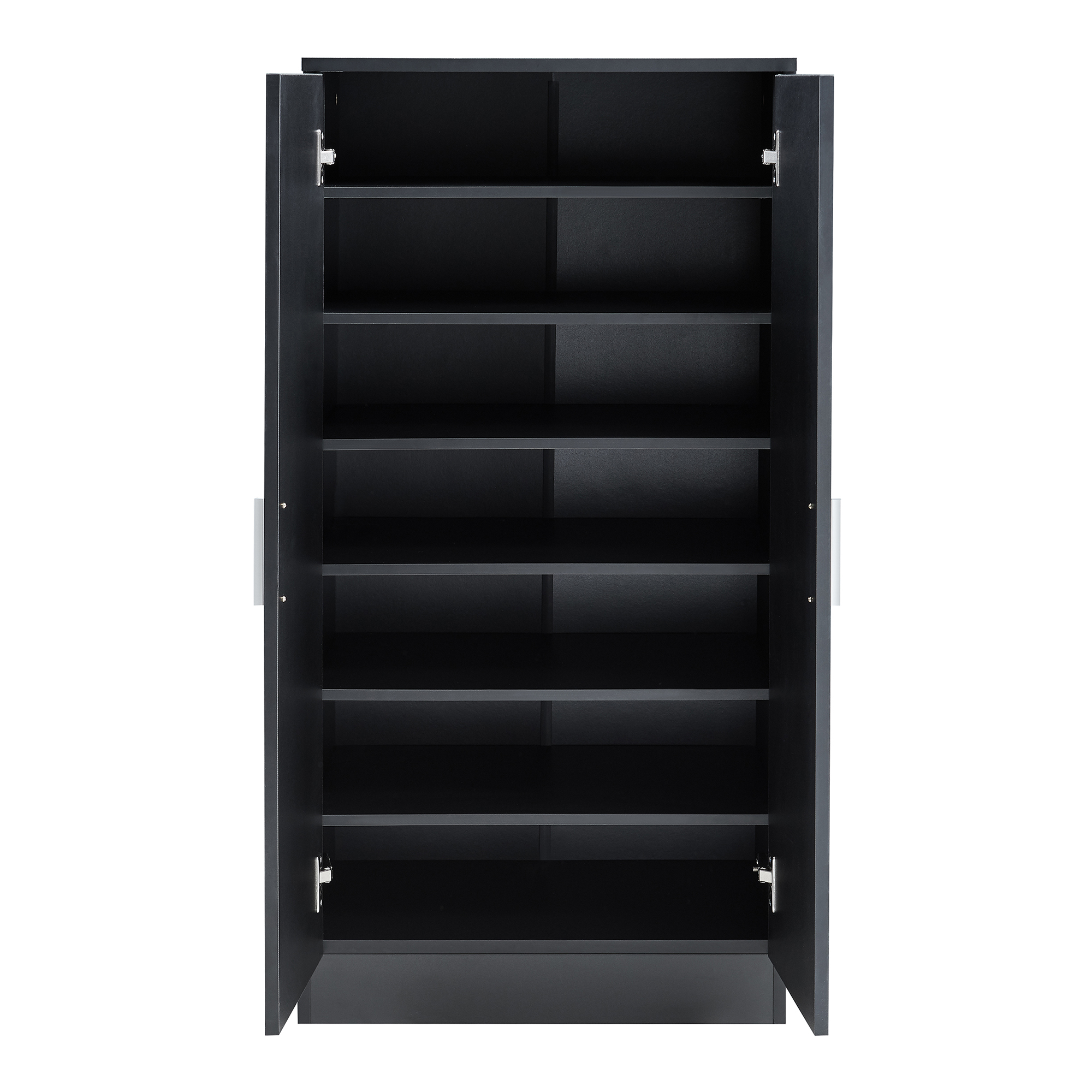 Pantofar cu 2 uși pentru organizarea eficientă și elegantă a încălțămintei în hol, dormitor sau dressing. Cu un design modern și finisaj negru versatil, această piesă de mobilier se integrează ușor în amenajări contemporane și oferă un spațiu bine compartimentat pentru depozitare.