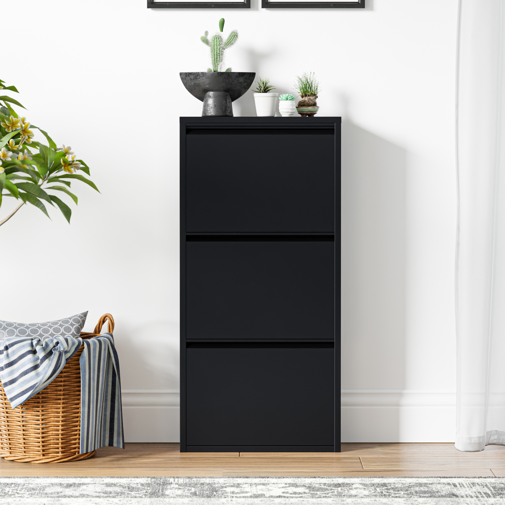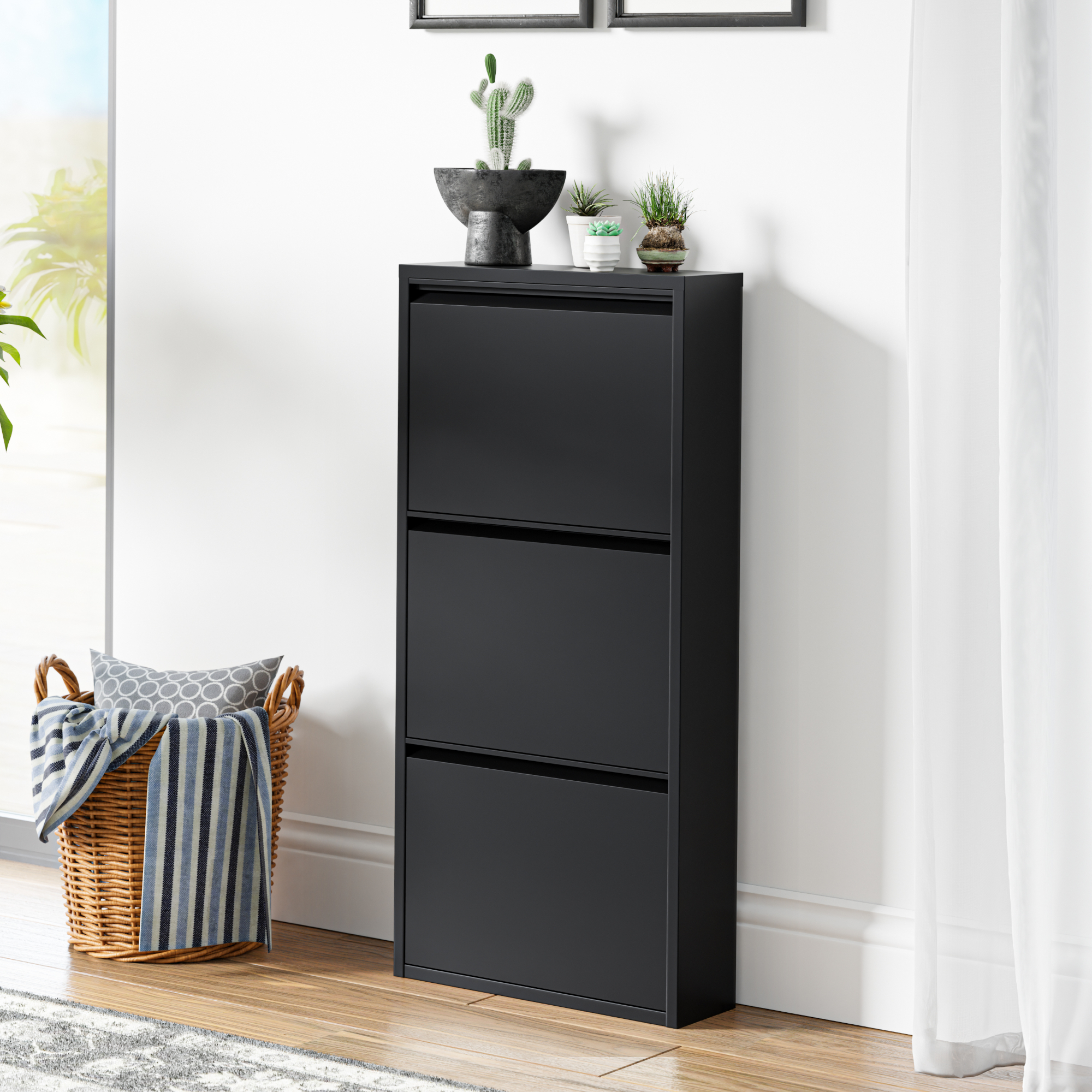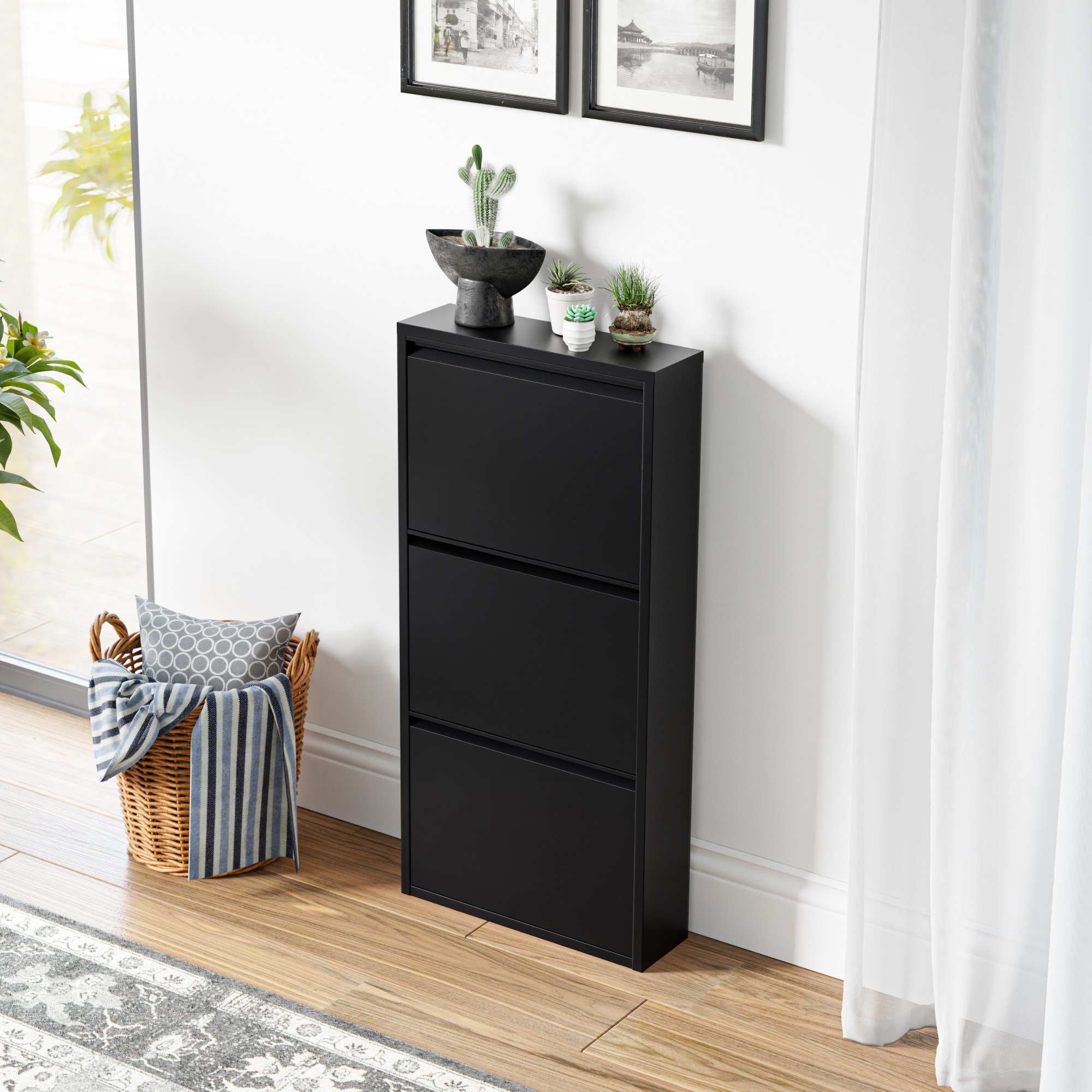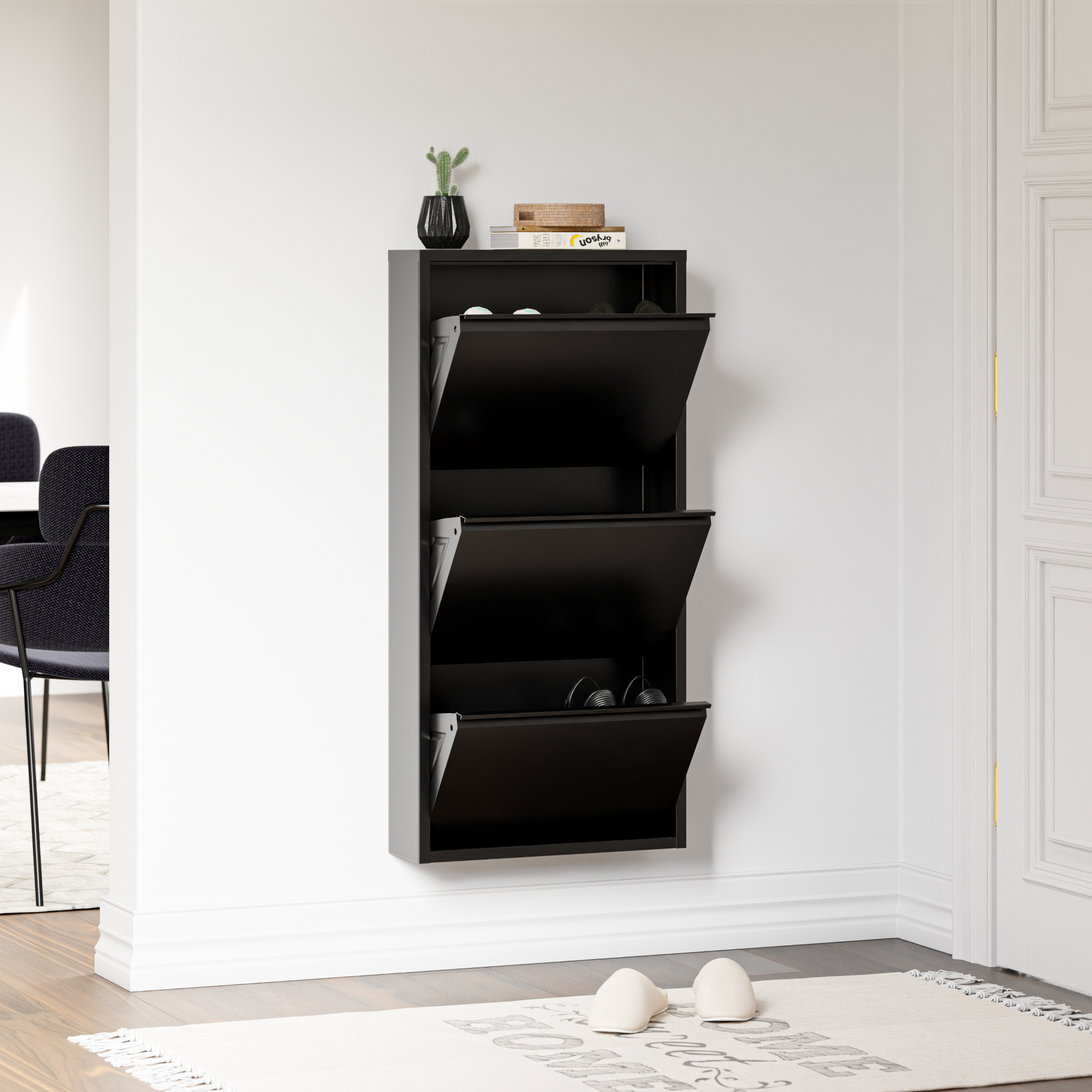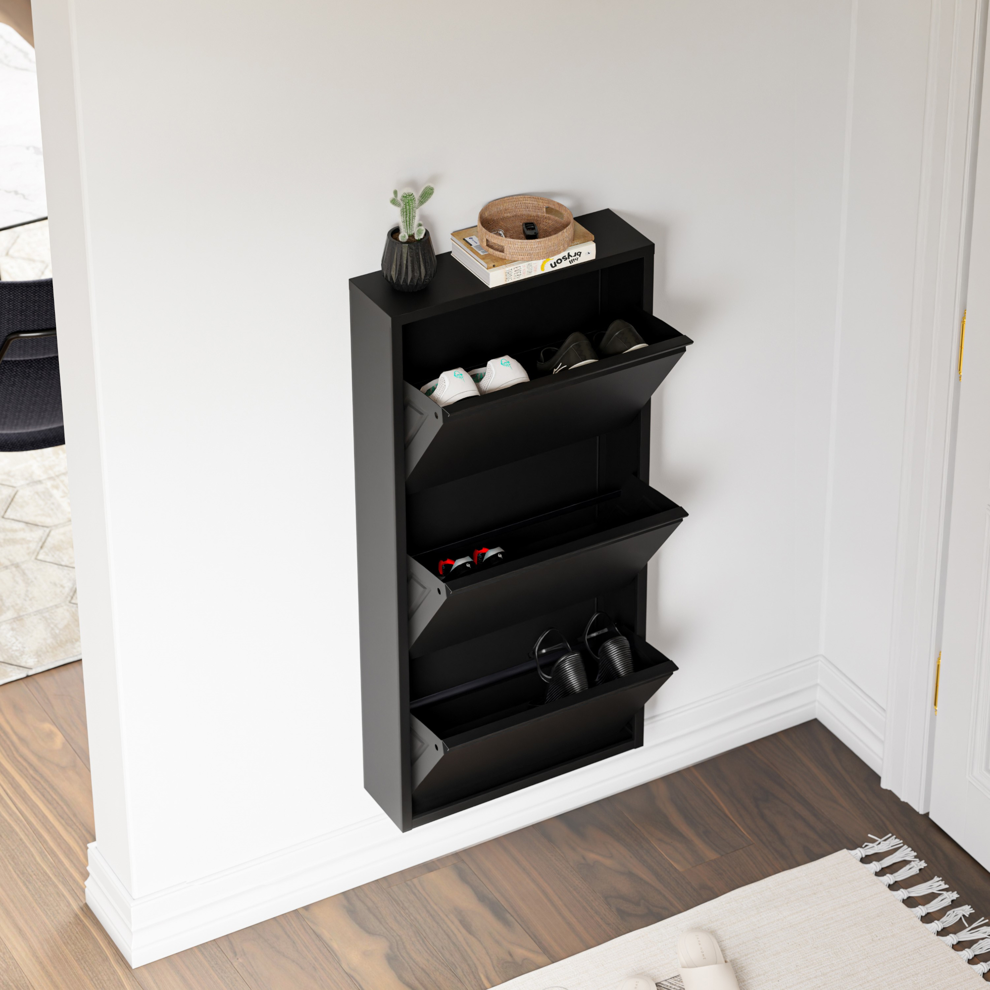 Cele 3 compartimente rabatabile permit sortarea eficienta a pantofilor, de la sneakers si pantofi sport pana la sandale sau alte tipuri de incaltaminte de zi cu zi. In plus, partea superioara functioneaza ca raft practic pentru chei, ochelari, corespondenta sau decoratiuni, fiind ideala pentru zona de intrare.