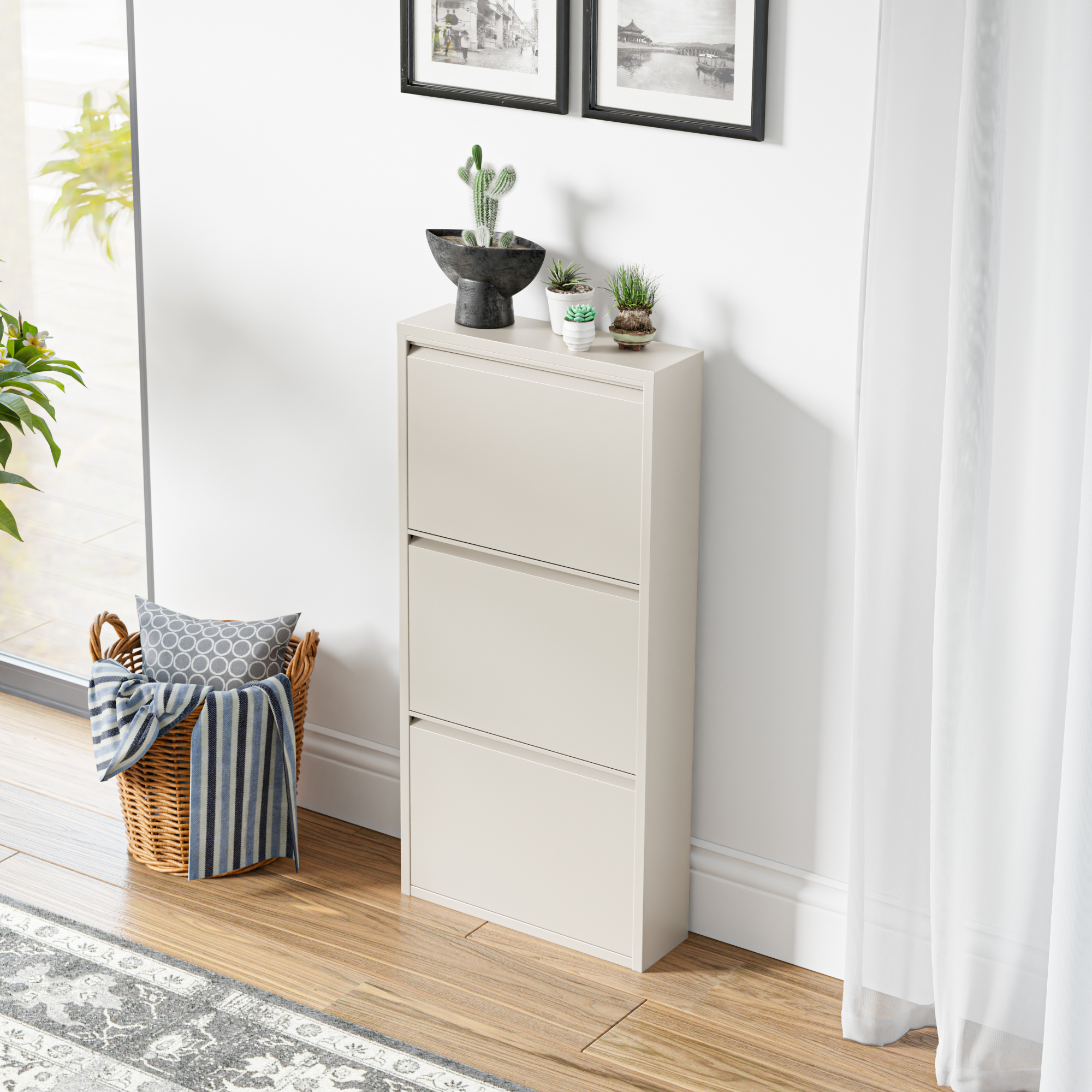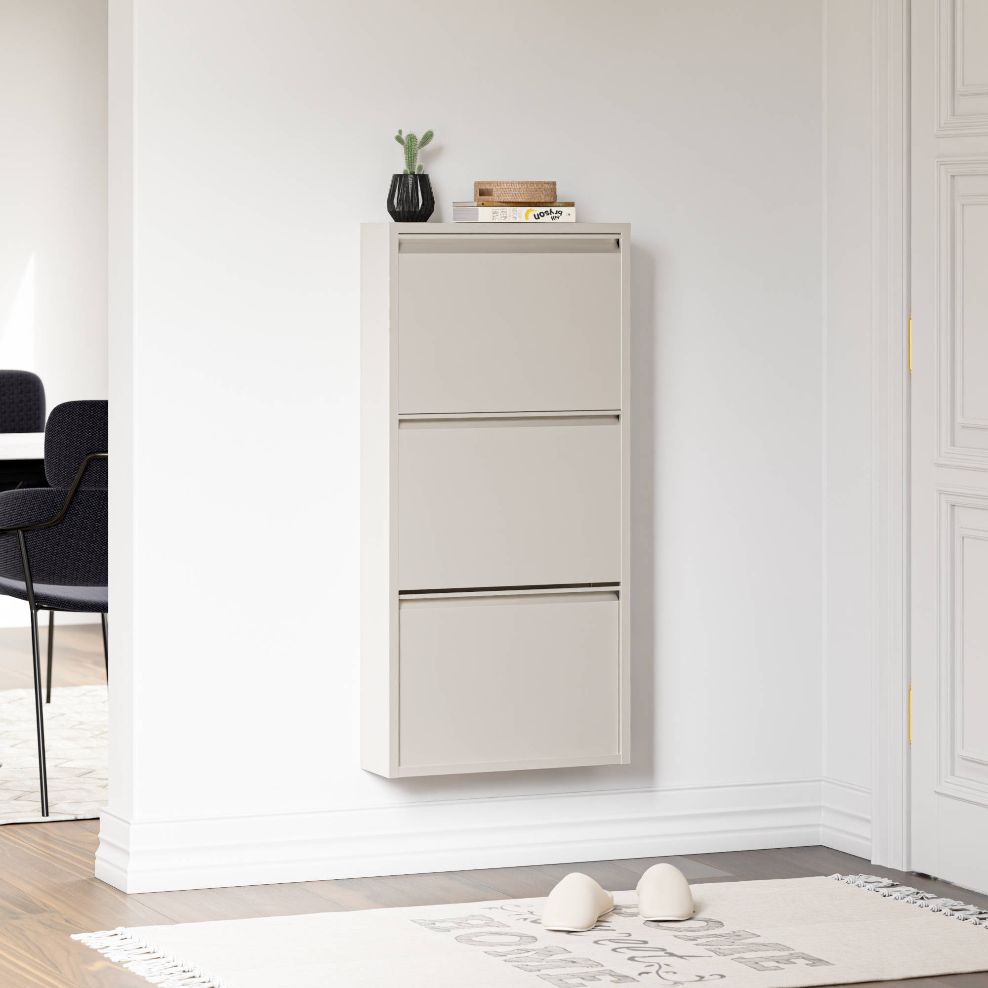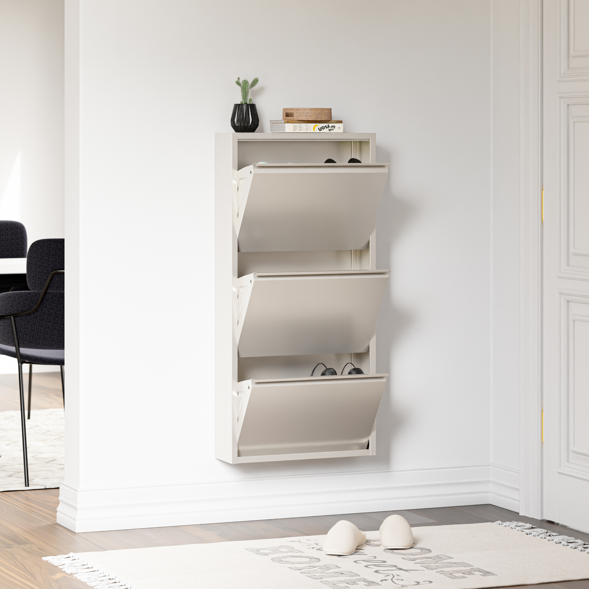 Cele 3 clapete se deschid separat, astfel încât să poți sorta simplu sneakers, pantofi sport, sandale sau alte tipuri de încălțăminte. În plus, partea superioară poate fi folosită ca poliță pentru accesorii, decorațiuni, chei, scrisori sau alte obiecte utile din zona de intrare.