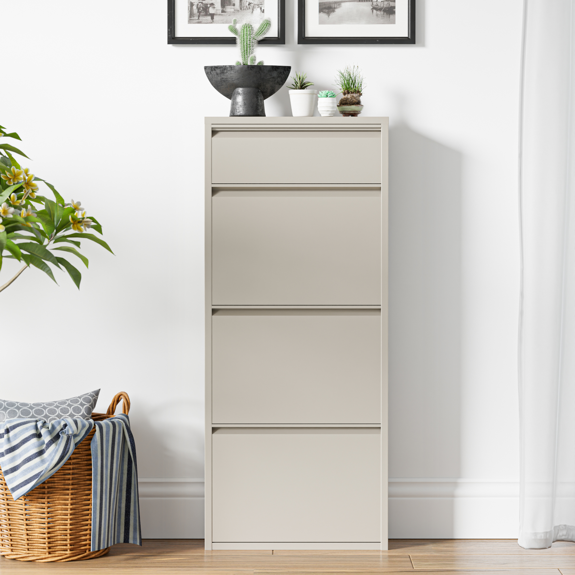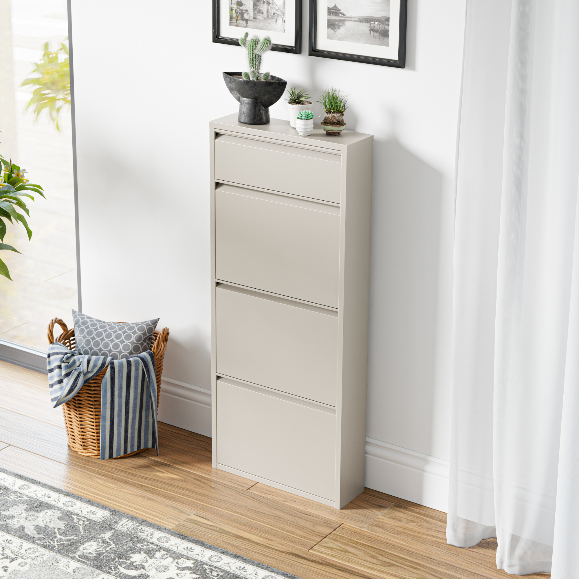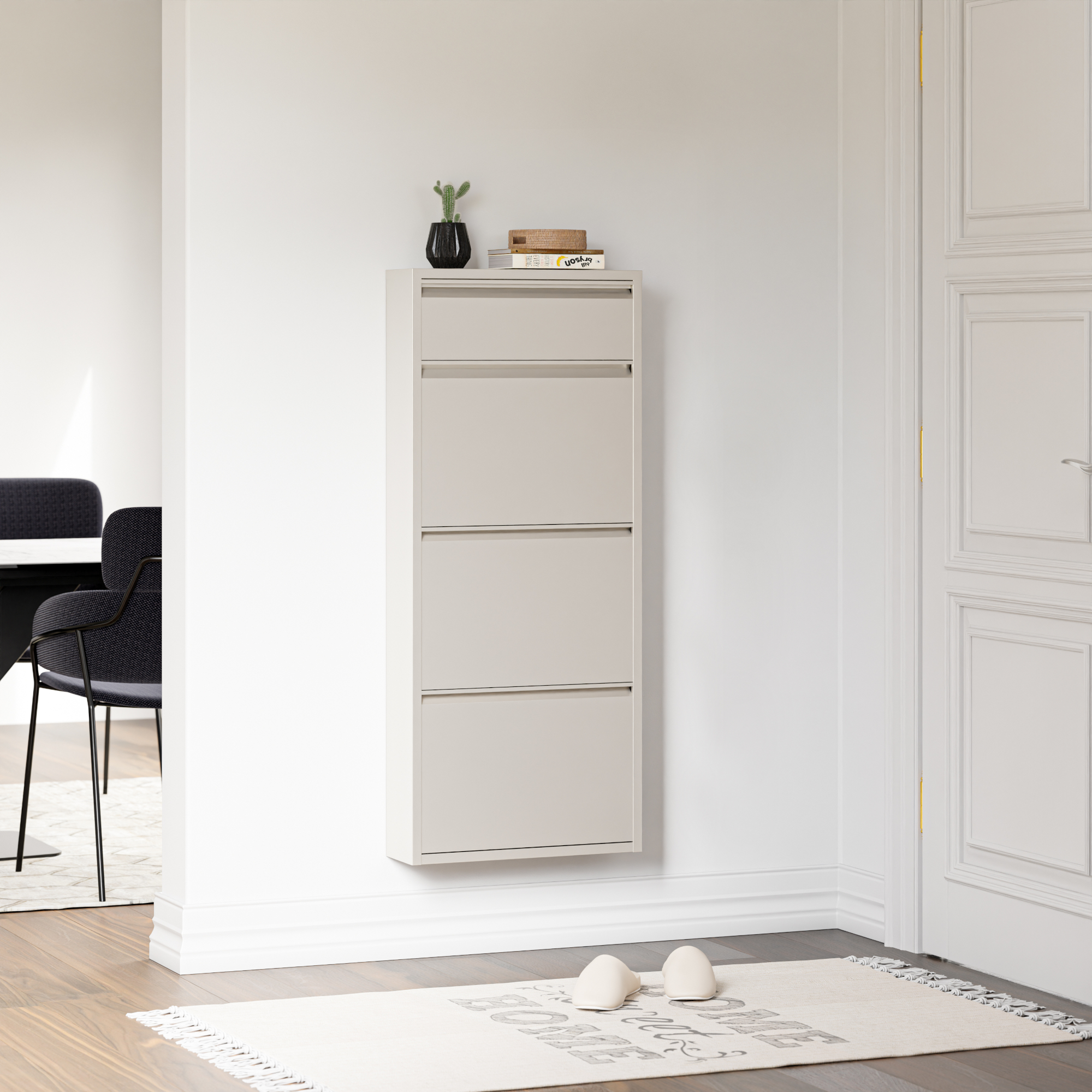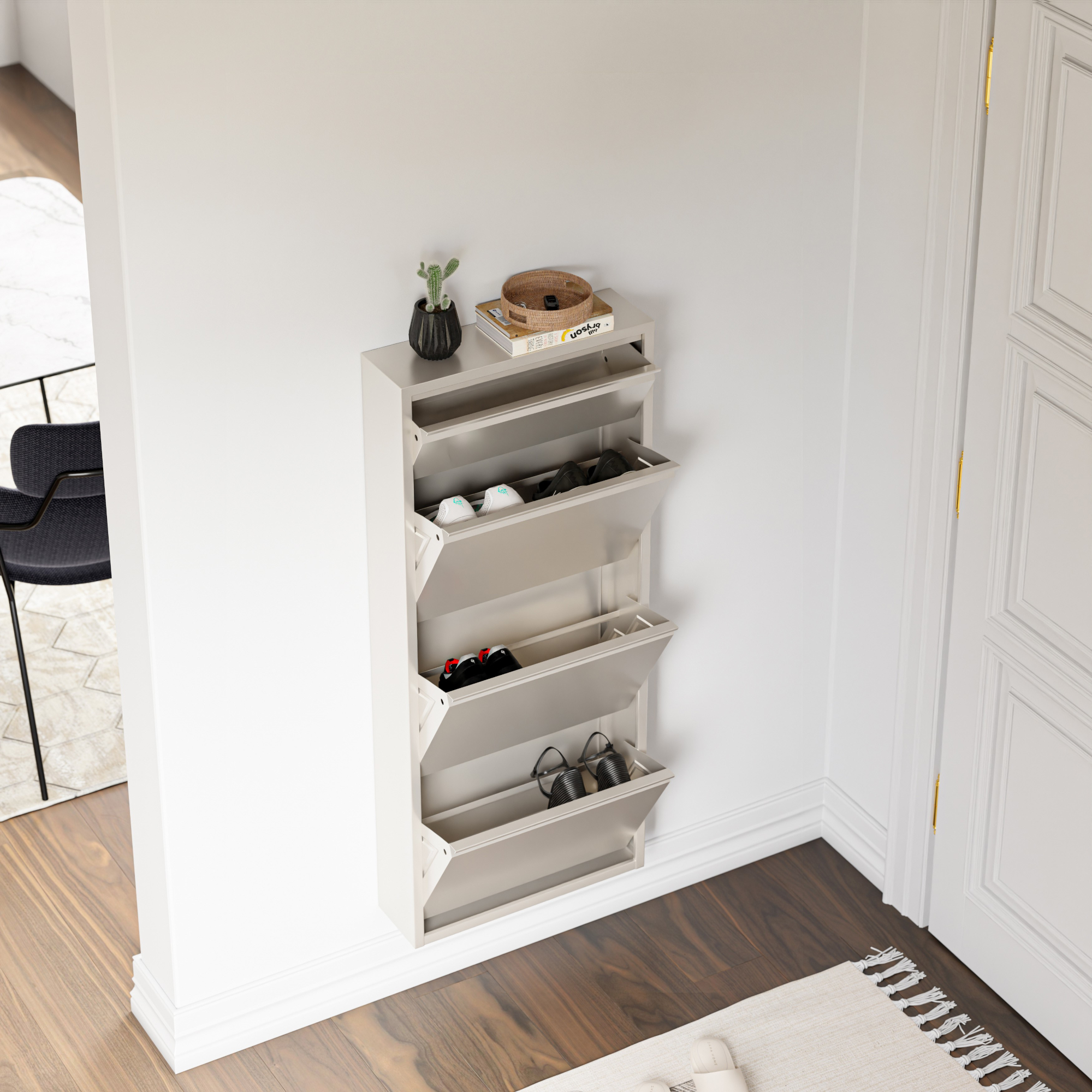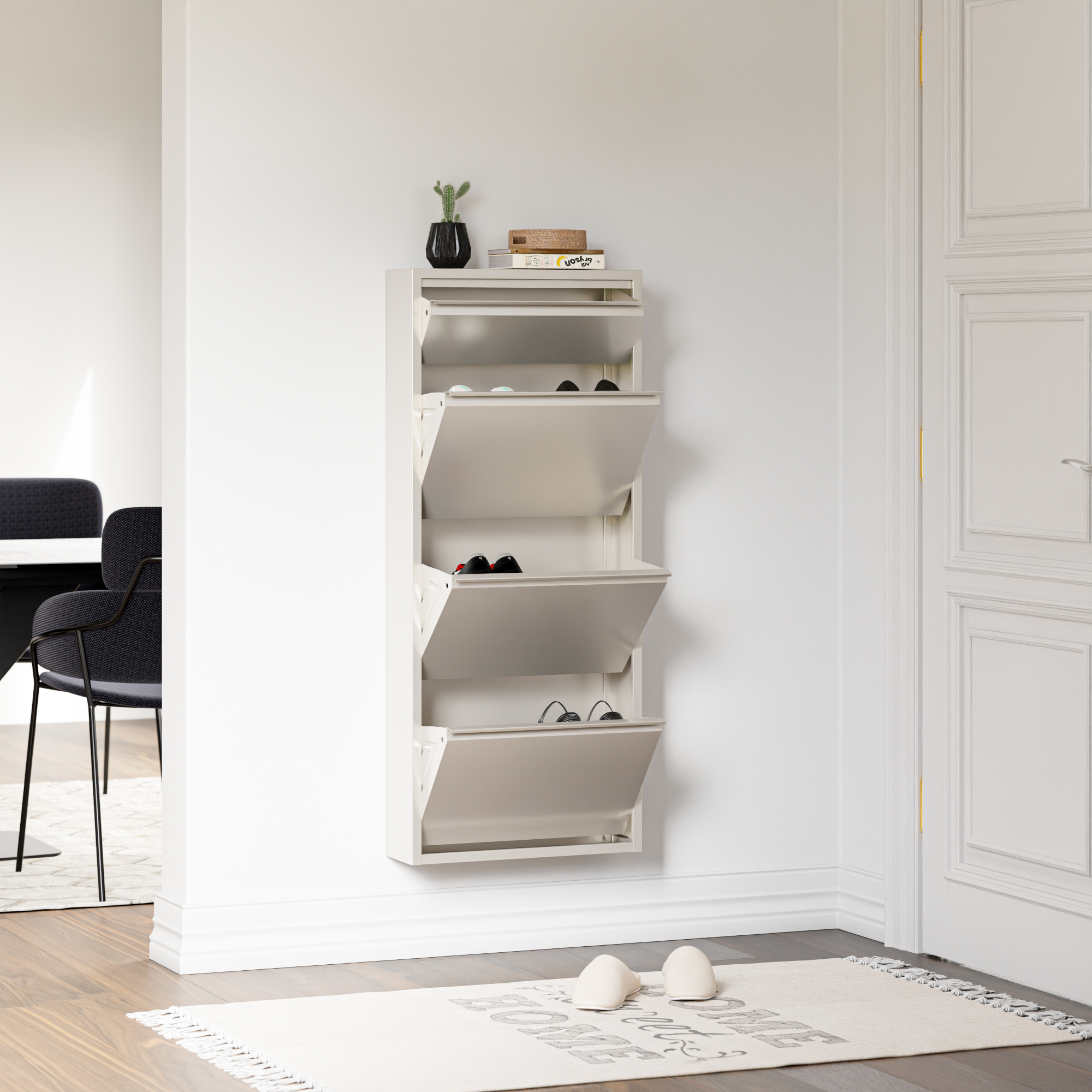 Cele 3 clapete mari permit sortarea eficientă a pantofilor sport, sneakerșilor, sandalelor sau altor tipuri de încălțăminte, iar compartimentul mic este ideal pentru cremă de pantofi, perii sau alte obiecte utile. În plus, partea superioară poate fi folosită ca poliță decorativă pentru chei, mănuși, ochelari, scrisori sau mici decorațiuni.