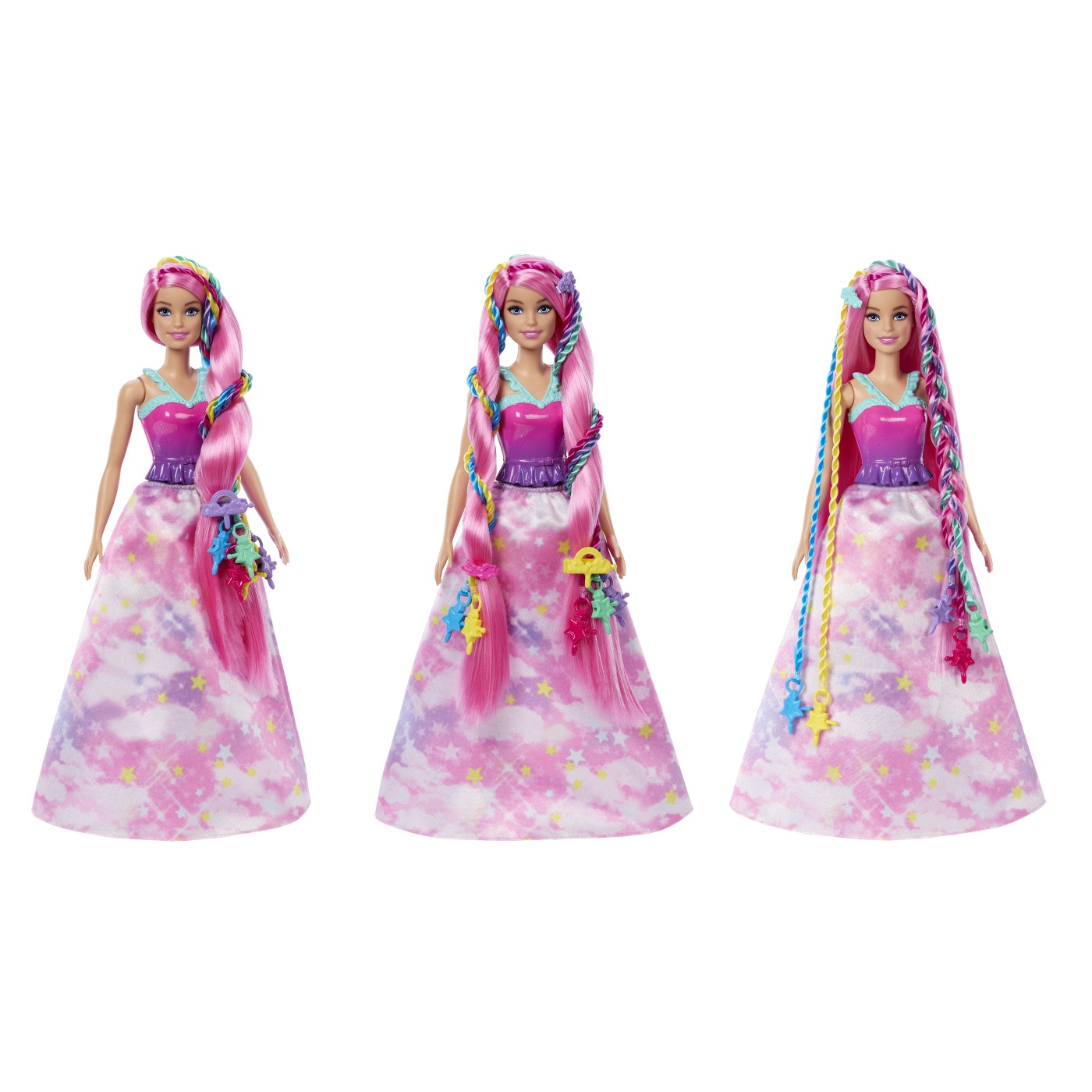 Papusa Barbie Dreamtopia cu aparat de coafat aduce in joaca un univers plin de culoare, imaginatie si stil. Cu par extra-lung, suvite in nuante de curcubeu si accesorii creative, aceasta papusa Barbie le invita pe micile stiliste sa creeze coafuri fantastice, impletituri si rasuciri spectaculoase.