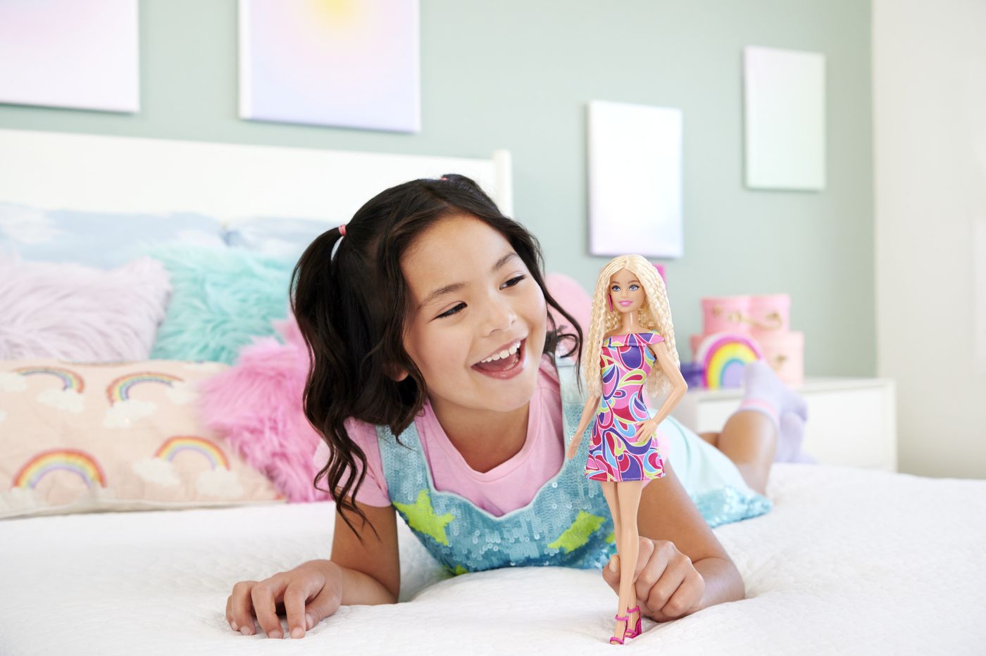 Păpușă Barbie Fashionistas blondă cu păr ondulat și rochie colorată