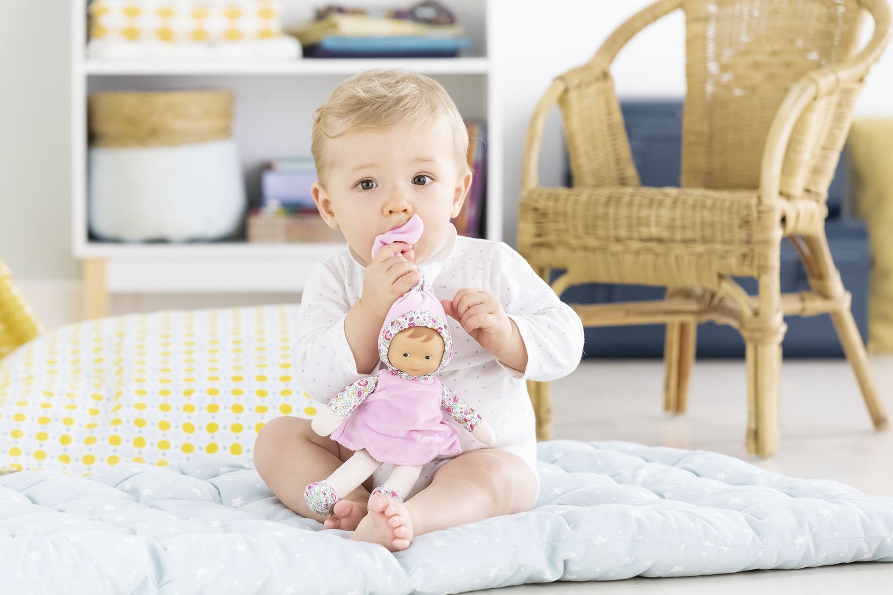Materialul ultra-moale o face plăcută la atingere, iar forma sa este gândită special pentru bebeluși, care o pot prinde de căciuliță, brațe, picioare sau rochiță. În plus, păpușa include o etichetă cusută pe care se poate scrie numele copilului sau un număr de telefon, un detaliu practic pentru părinți.