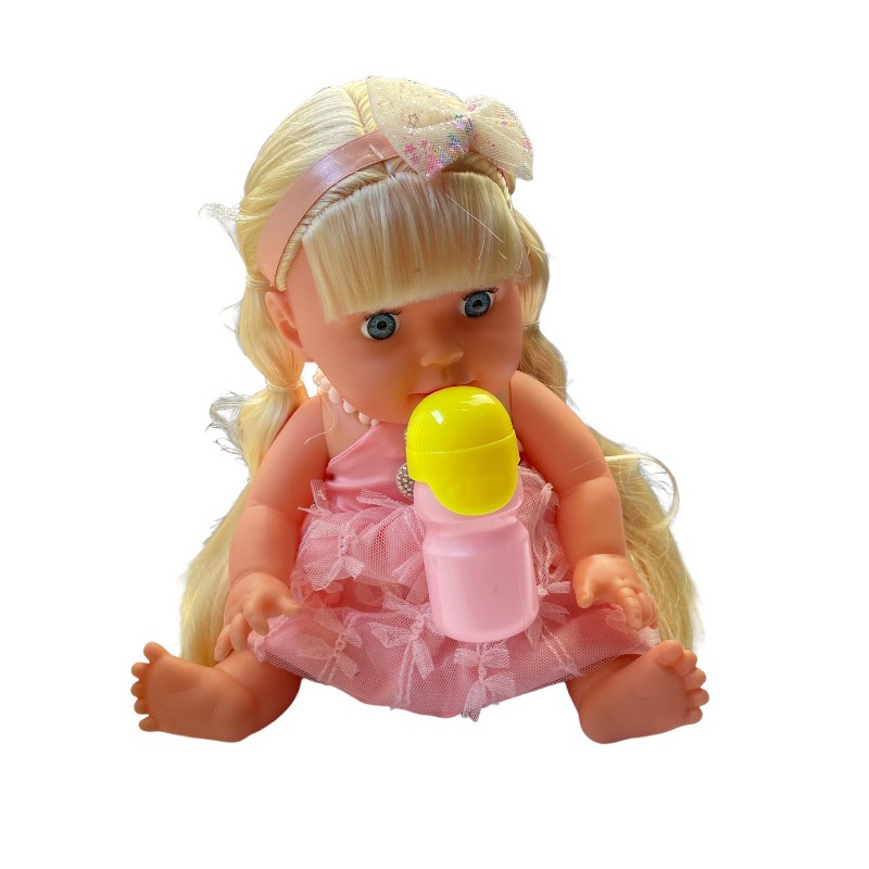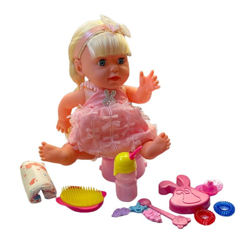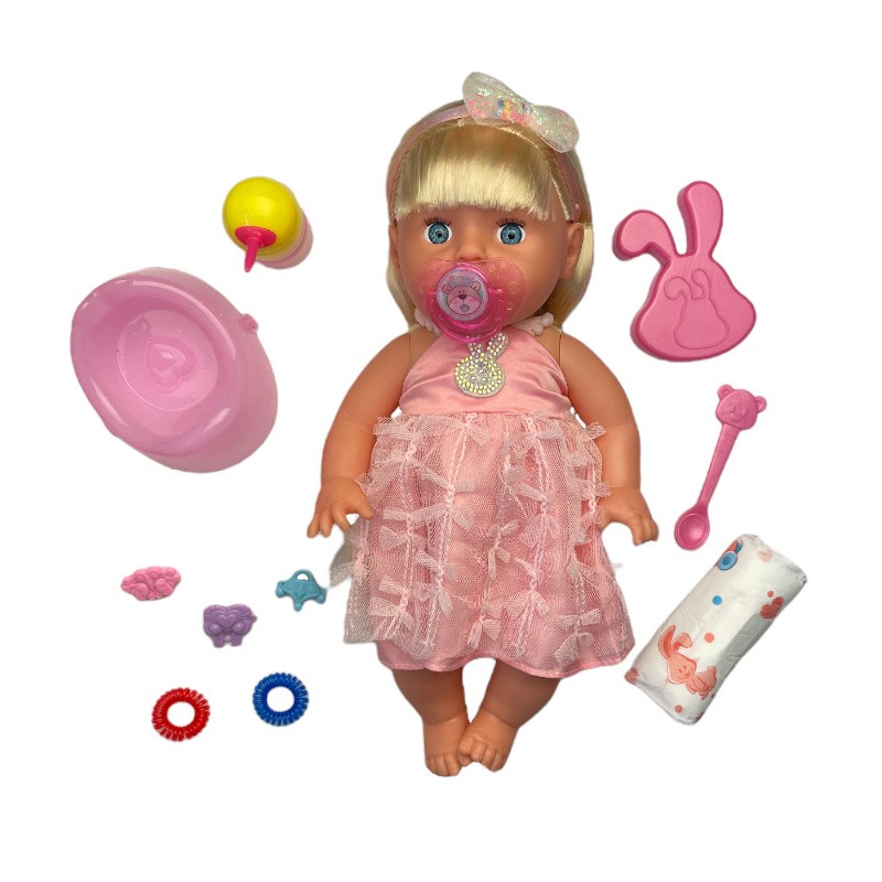 - accesorii incluse: rochita si bentita, perie de par si accesorii coafat, scutec, biberon, suzeta magica, olita, farfurie si lingurita;