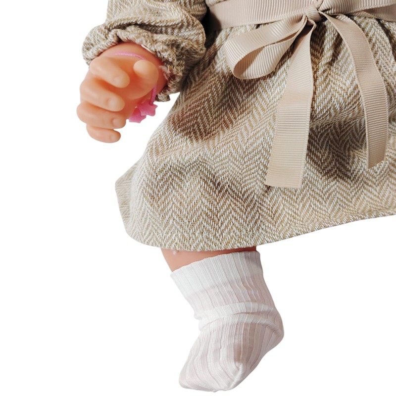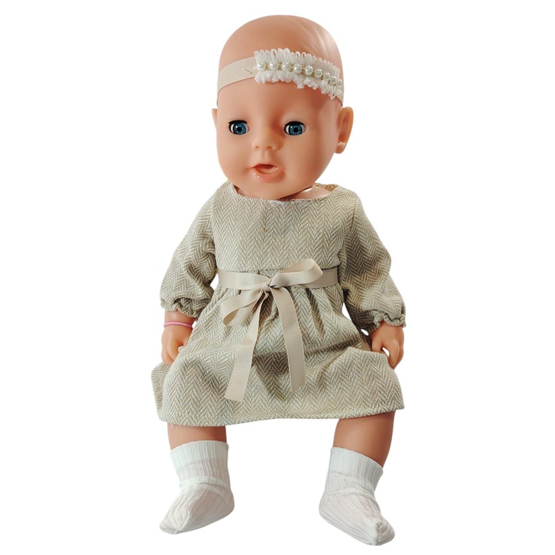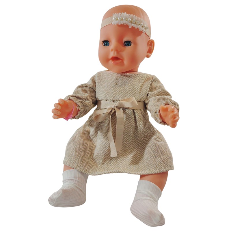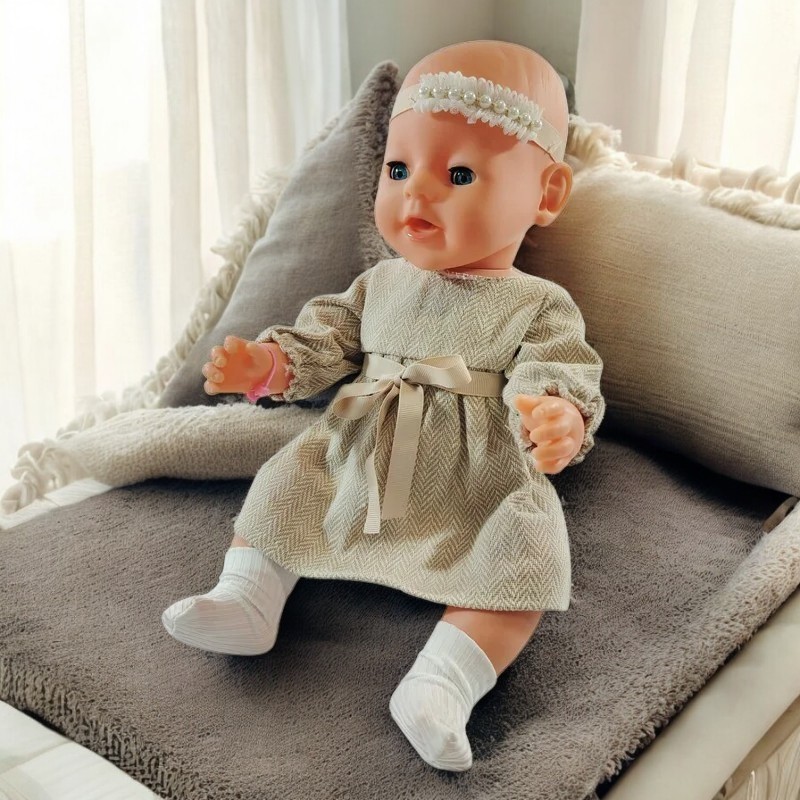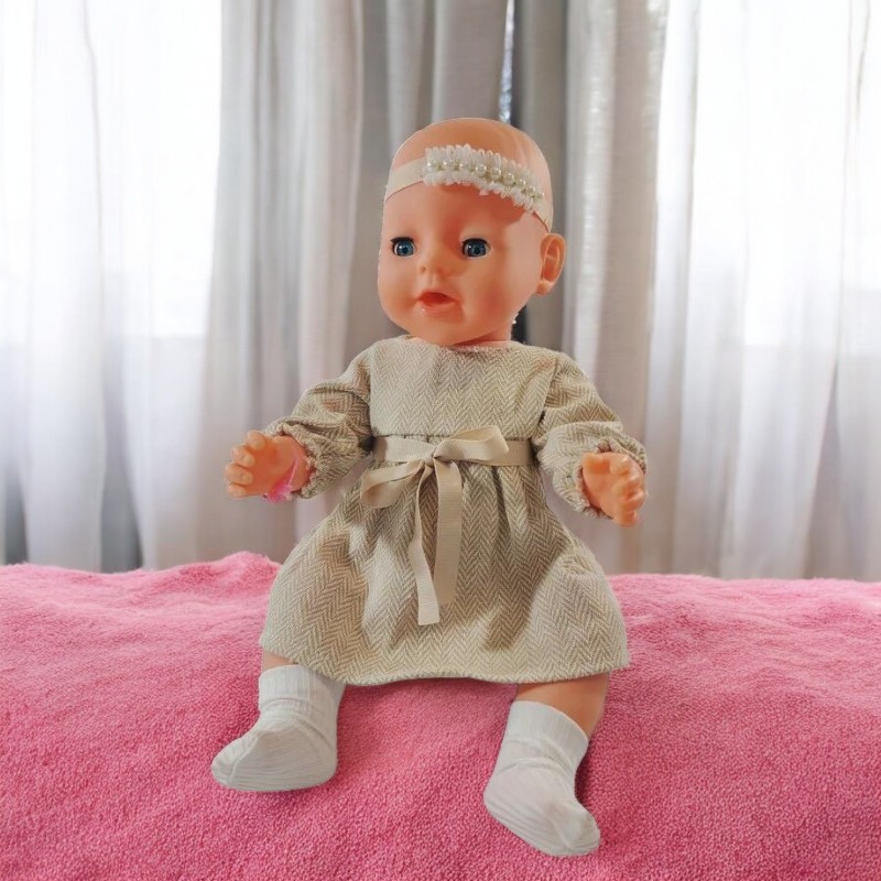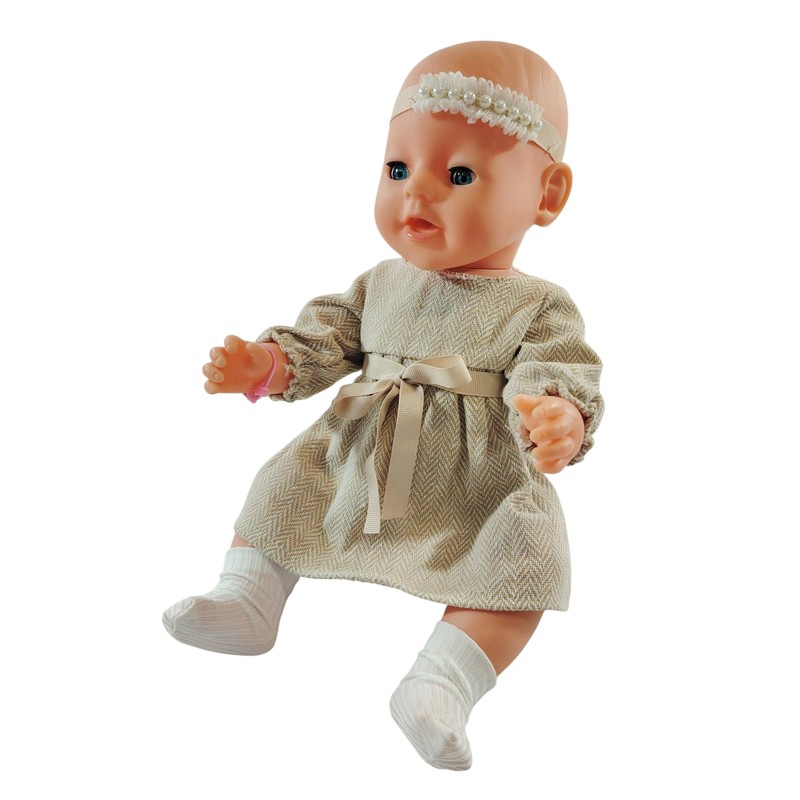 Papusa este imbracata intr-o rochita adorabila, decorata cu o fundita, care adauga un plus de eleganta. Rochita este detasabila, astfel incat copiii o pot imbraca si dezbraca, stimulandu-le creativitatea. Olita este inclusa pentru momentele cand papusa "face pipi". Aceasta ajuta copiii sa imite activitatile de antrenament la olita si sa exerseze rolurile de ingrijire. De asemenea, setul include o suzeta care poate fi pusa in gura ei, perfecta pentru a calma "bebelusul", dar si un scutec care le ofera celor mici un mod realist de a ingriji papusa si de a invata despre responsabilitate.