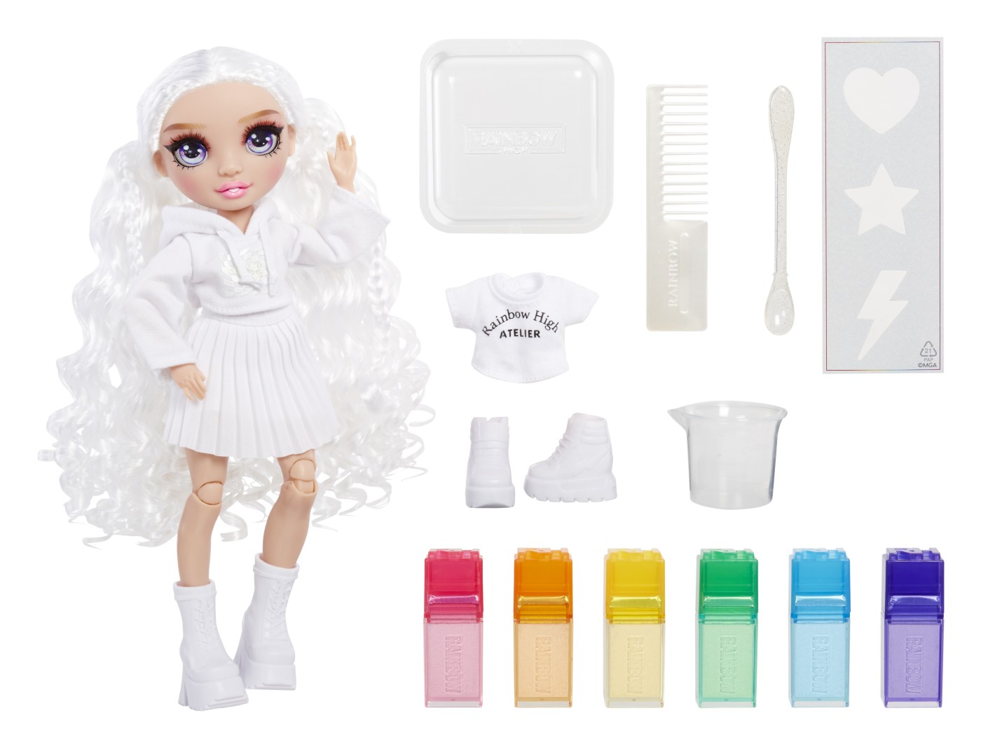 - Continut pachet: 1 papusa exclusiva, tinuta alba completa, tricou bonus, pantofi bonus, 6 culori lavabile, burete cu doua capete, elastice, sablon, pahar de masurare, bol, lingura, pieptene si suport pentru papusa