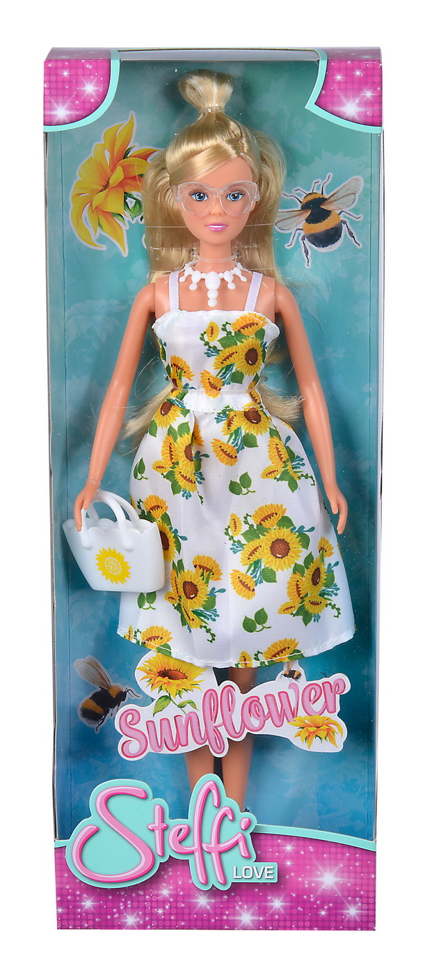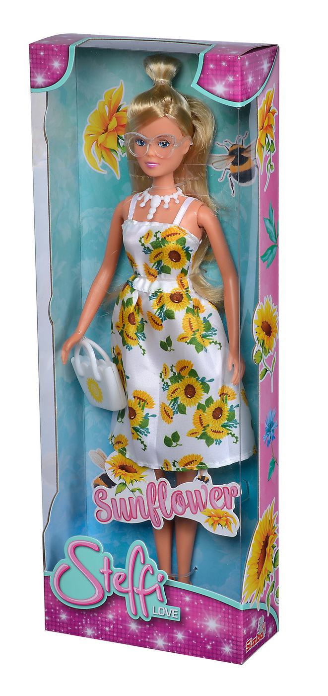 Descriere Papusa Steffi rochie alba imprimeu floarea-soarelui,
