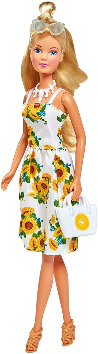 Papusa Steffi cu rochie alba si imprimeu floarea-soarelui, 29 cm