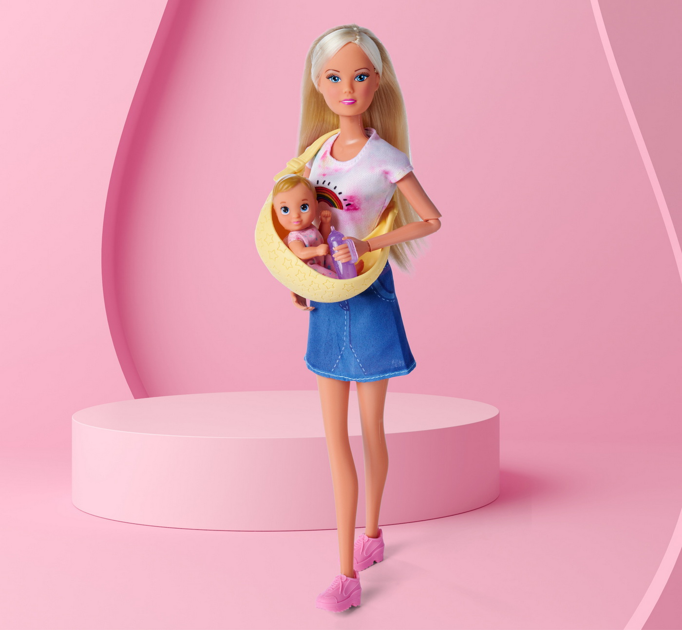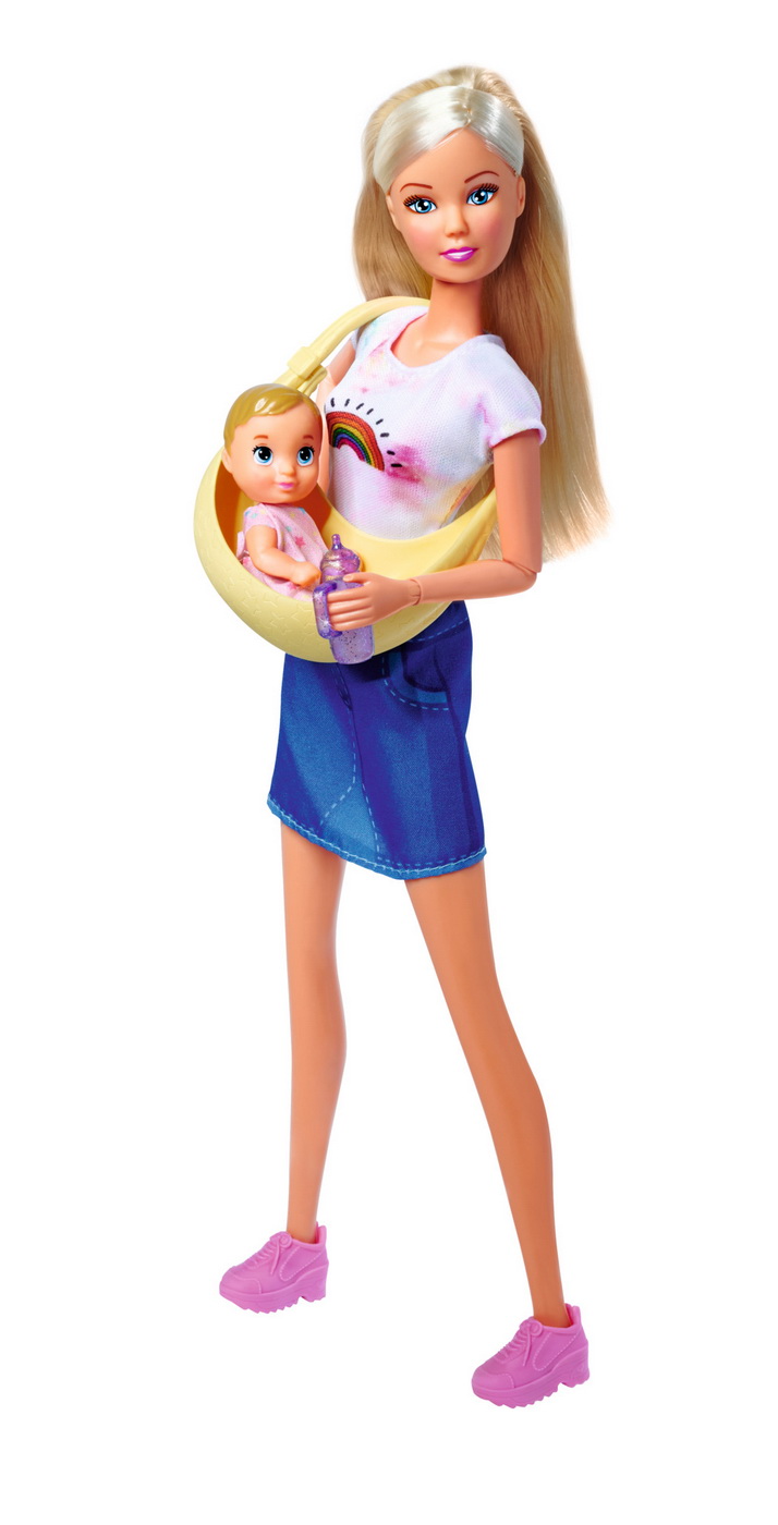 Cei mici pot crea diferite scenarii de ingrijire, plimbare si joaca alaturi de Steffi si bebelusul ei. Port bebe-ul este ideal pentru a transporta bebelusul in timpul aventurilor imaginare, iar biberonul completeaza rutina de hranire.