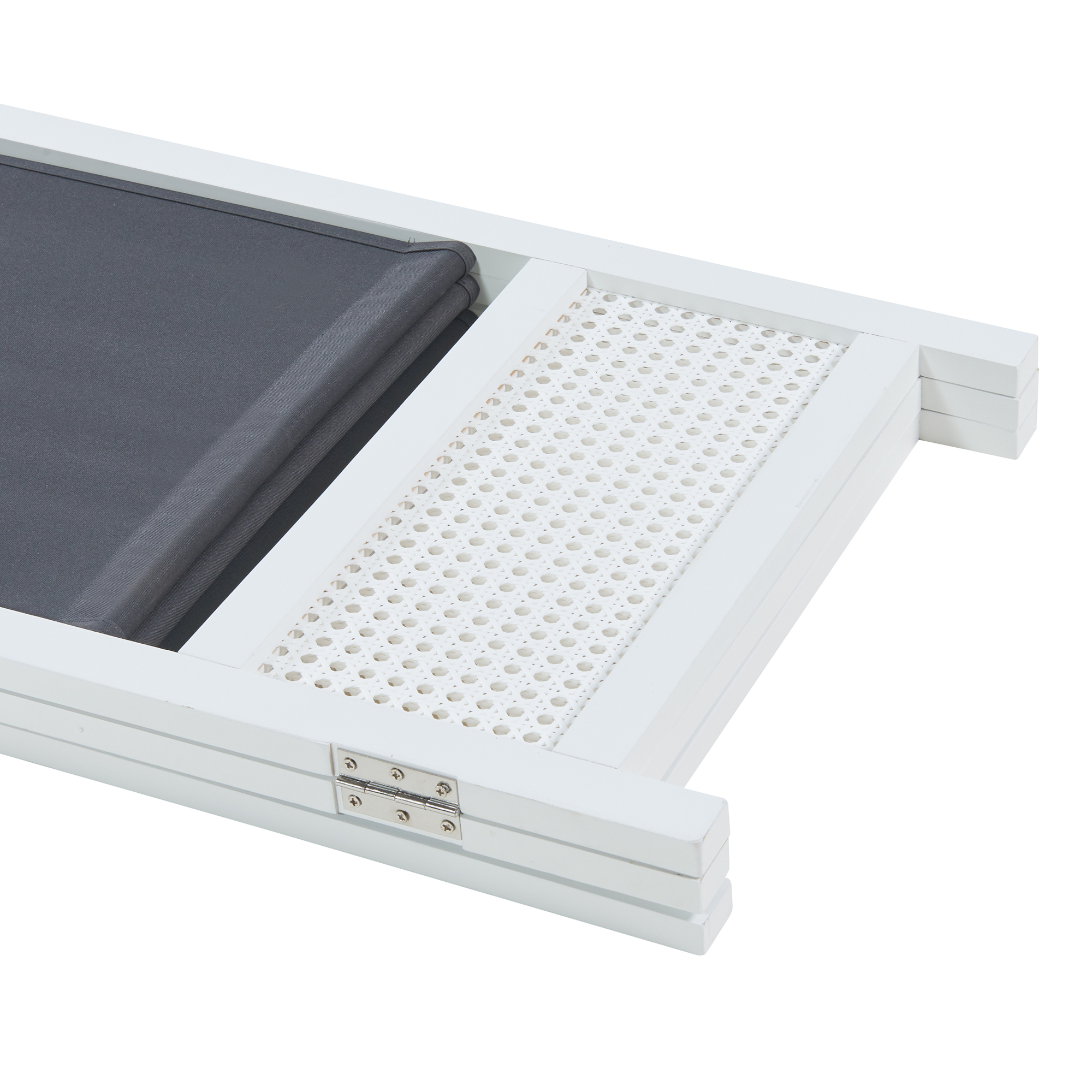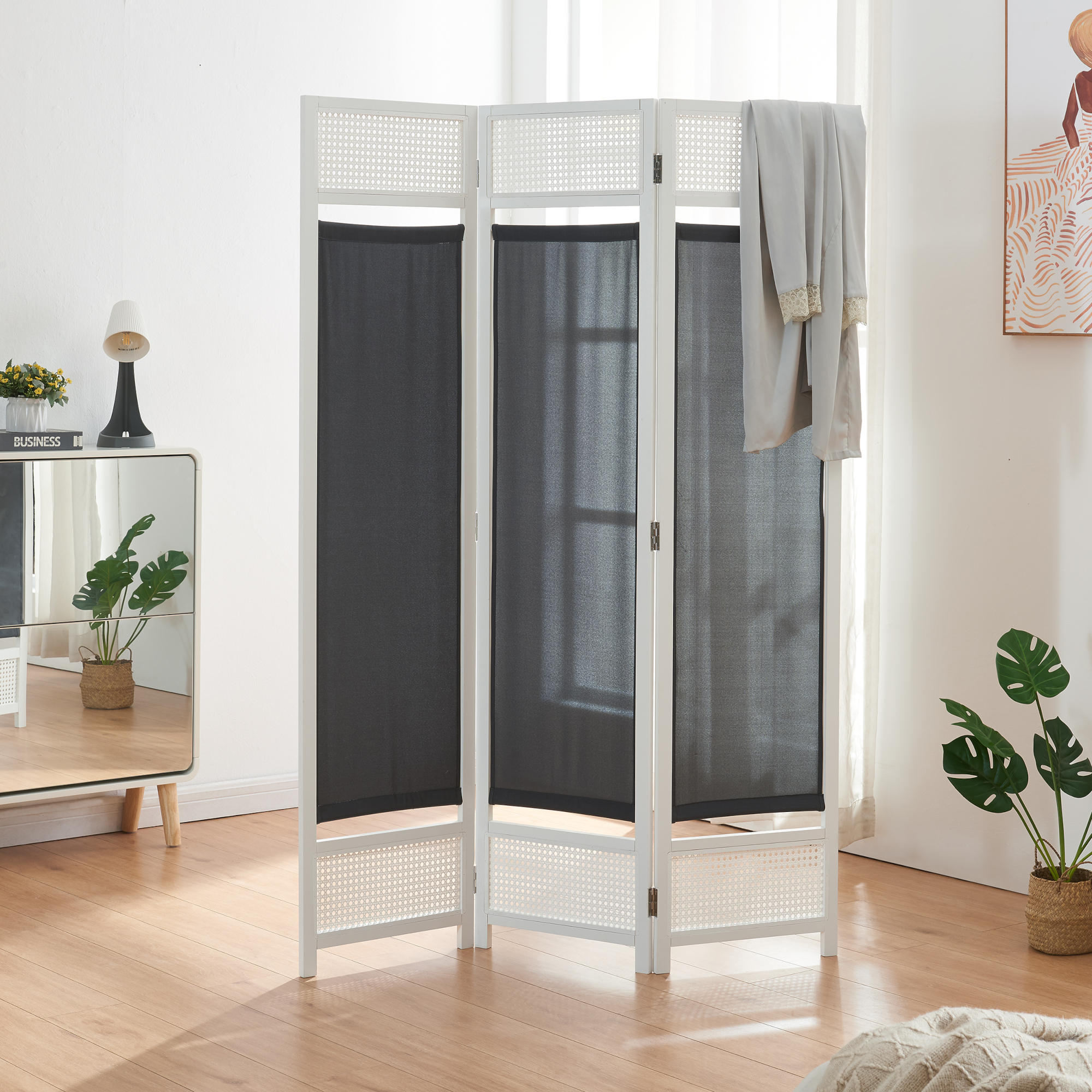 Designul său modern combină un cadru din bambus cu panouri decorative din PVC cu aspect de ratan și un material textil opac, rezistent, în nuanțe de alb și gri închis. Datorită construcției ușoare și pliabile, acest paravan pliabil este simplu de mutat, de poziționat și de depozitat atunci când nu este folosit.
