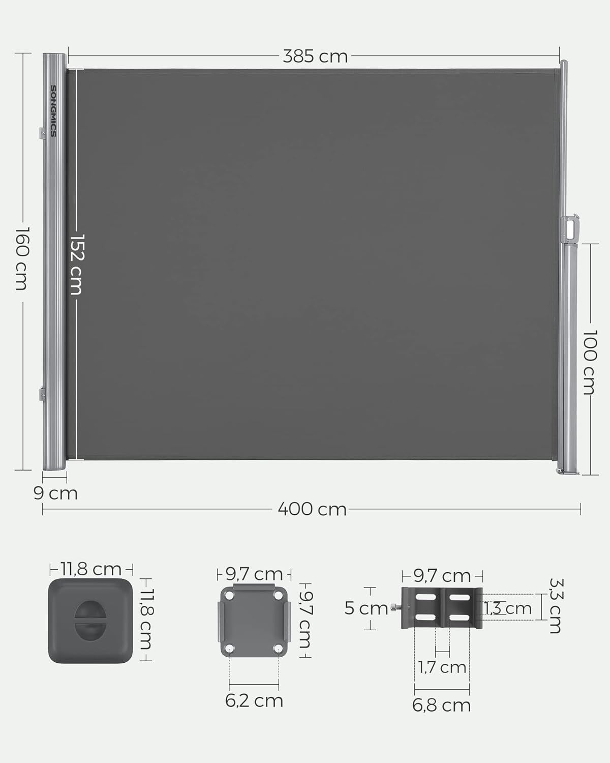 Alege un paravan lateral retractabil practic si elegant pentru mai multa intimitate pe terasa, balcon sau in gradina. Acest model SONGMICS de 160x400 cm creeaza rapid o zona protejata de privirile vecinilor, de vantul usor si de razele puternice ale soarelui. Materialul textil rezistent, cu strat PU si protectie UPF 50+, este potrivit pentru utilizare in exterior si isi pastreaza bine aspectul in timp.