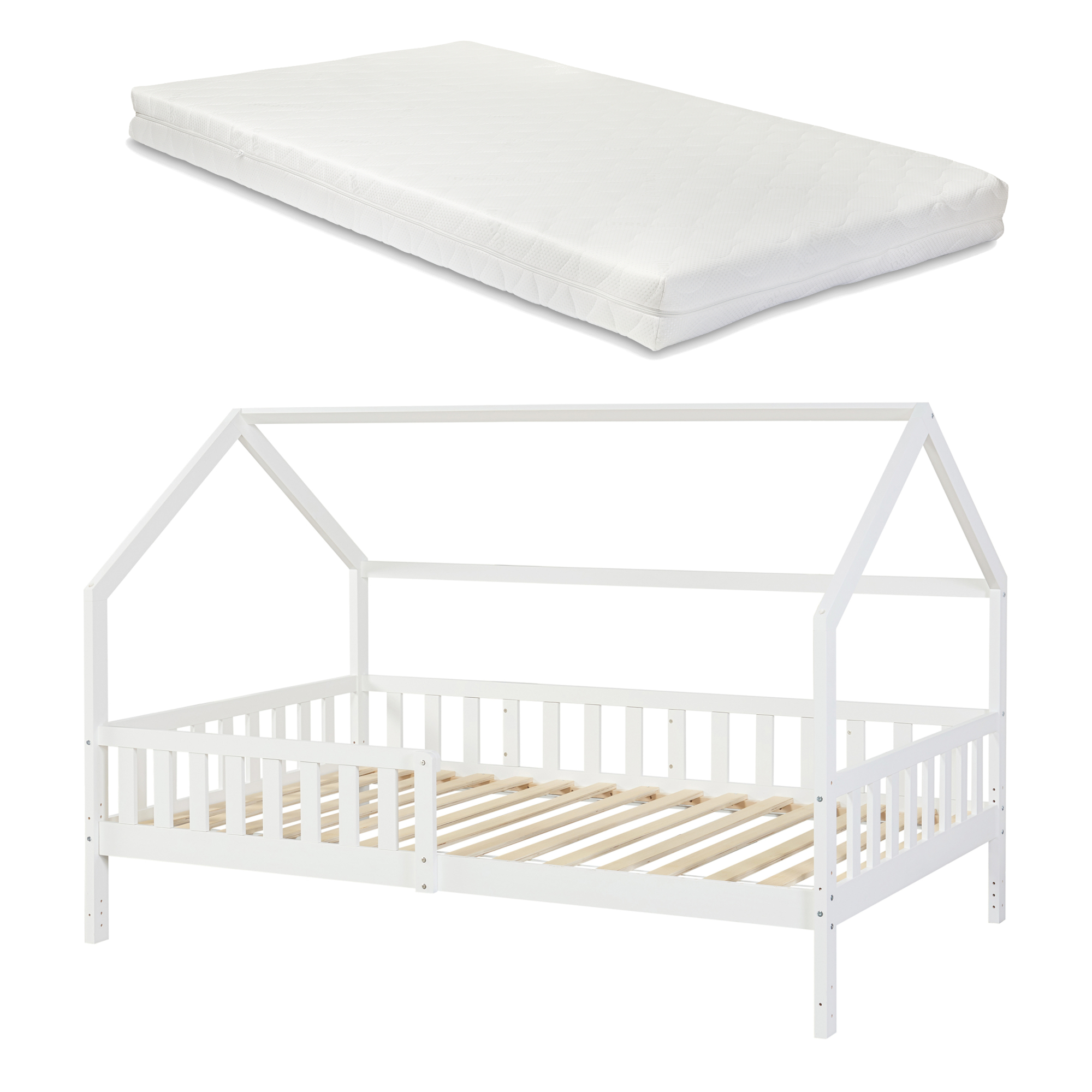 Pat căsuță pentru copii cu saltea 120x200 cm, alb, din lemn de pin