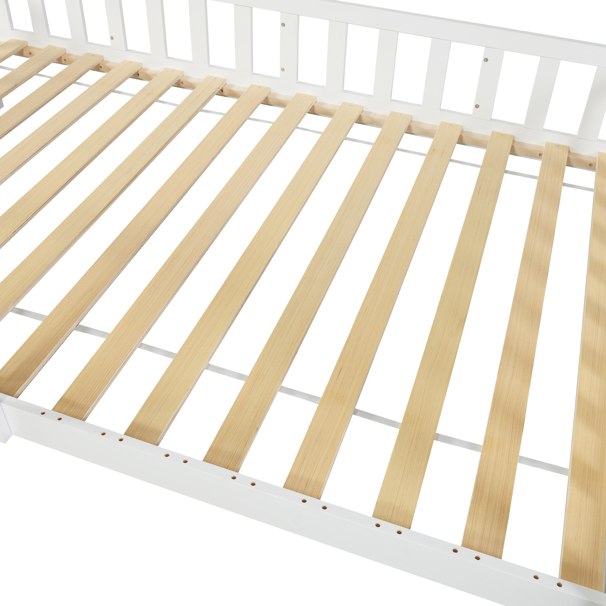 Acest pat copii din lemn de pin oferă nu doar un loc confortabil pentru odihnă, ci și mai multă siguranță în timpul somnului. Marginea tip gard funcționează ca protecție anti-cădere, iar montajul flexibil permite alegerea unei poziții mai joase pentru un plus de stabilitate sau a unei variante care lasă loc de depozitare dedesubt.