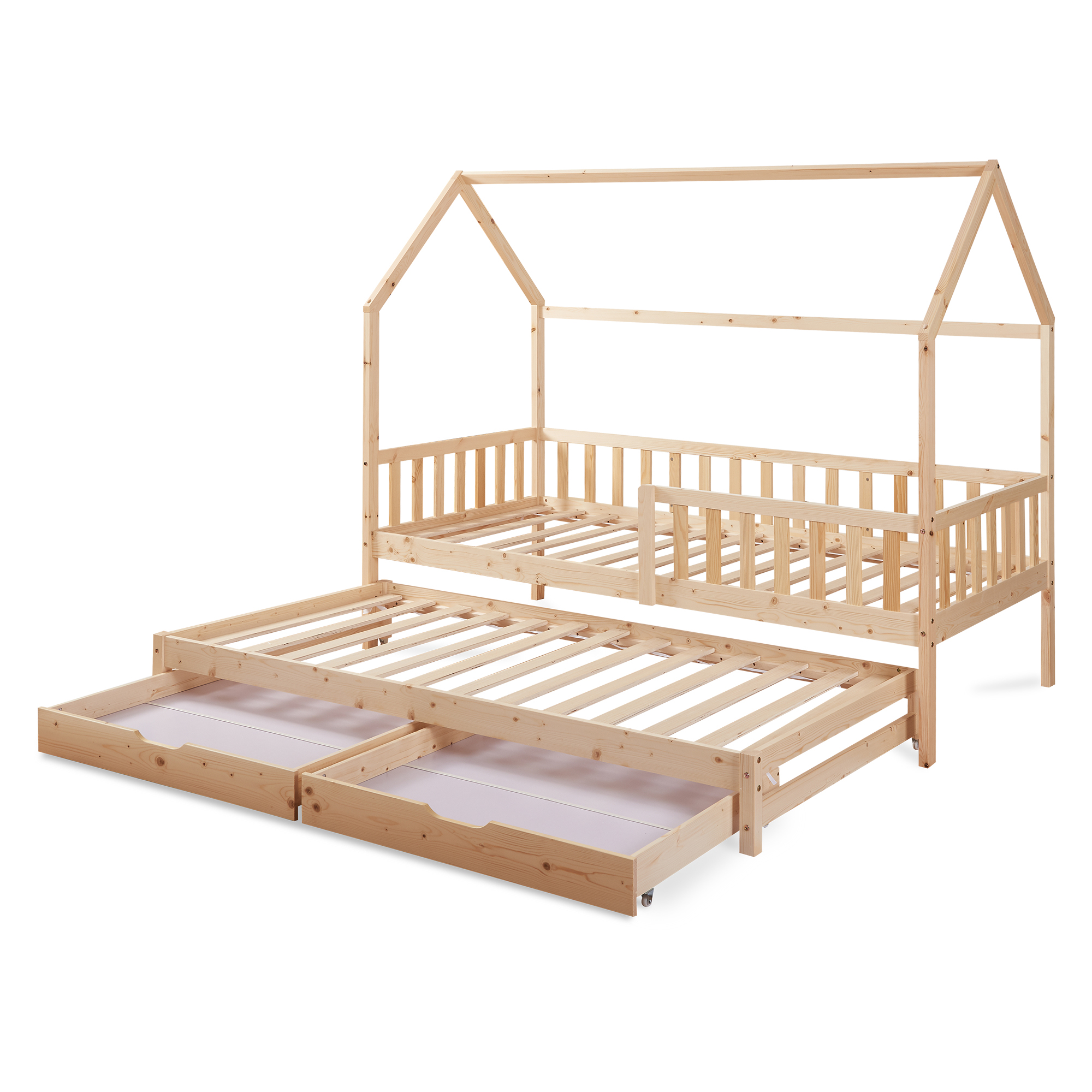 Pat copii dublu tip căsuță 90x200 cm din lemn de pin natur