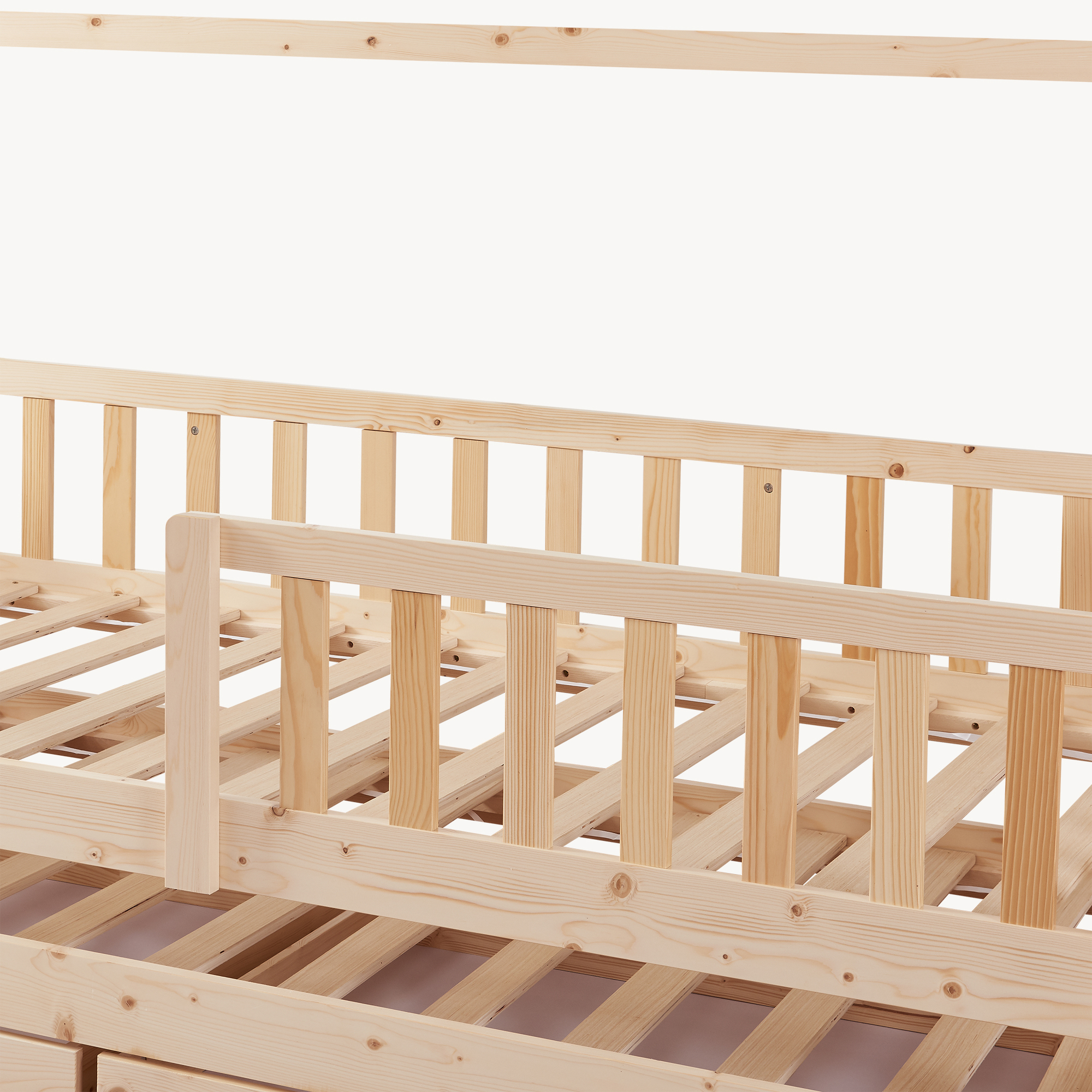Structura din lemn de pin natur este stabilă și durabilă, iar somiera cu lamele din lemn susține corect salteaua și favorizează circulația aerului. Barele superioare permit decorarea ușoară cu ghirlande sau lumini ambientale, pentru un colț personalizat și vesel. Suprafața este ușor de curățat și tratată cu lacuri sigure pentru copii.