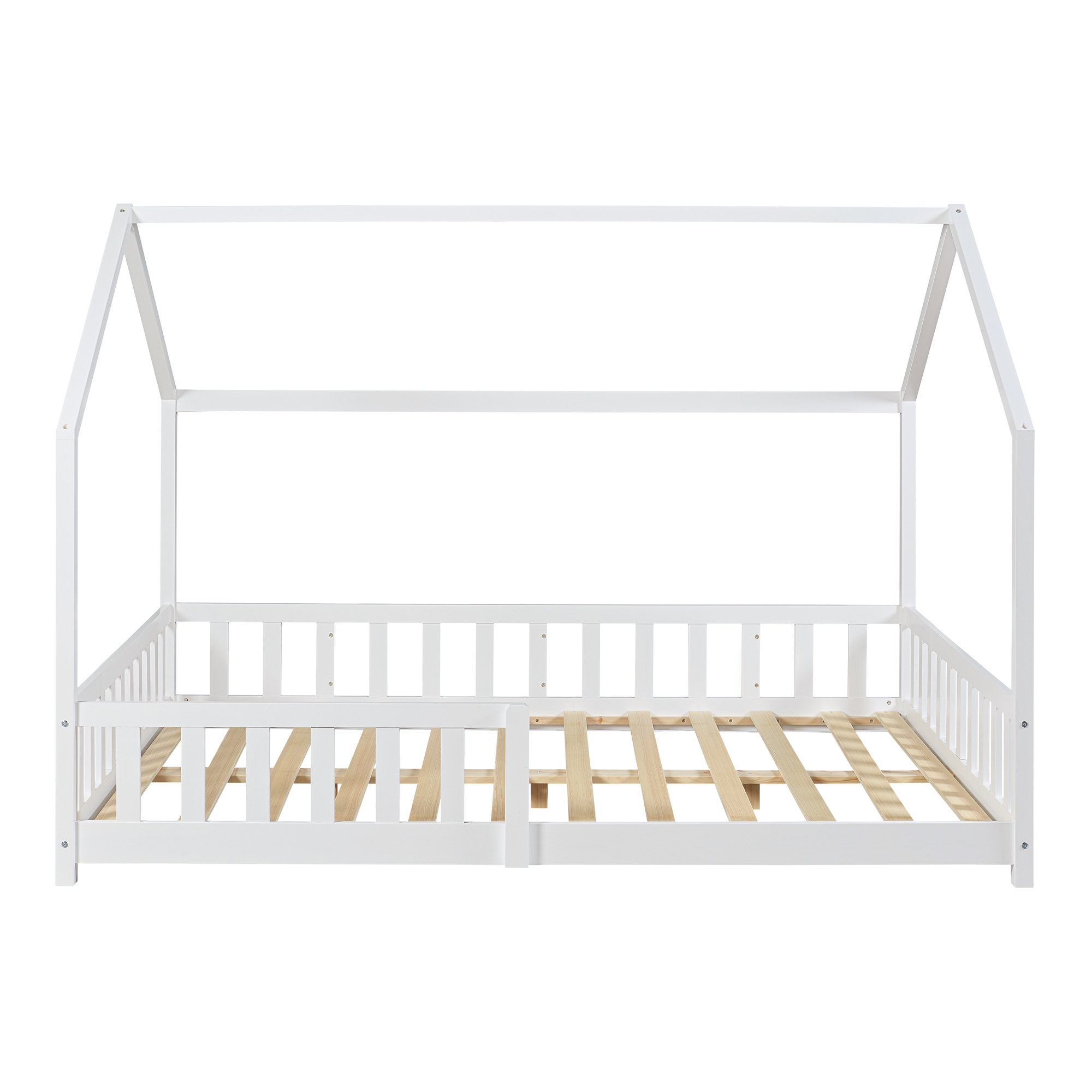 Pat Copii Hesel tip Casuta Montessori 140x200cm cu Protectie Impotriva Caderilor, Lemn de Brad, Alb