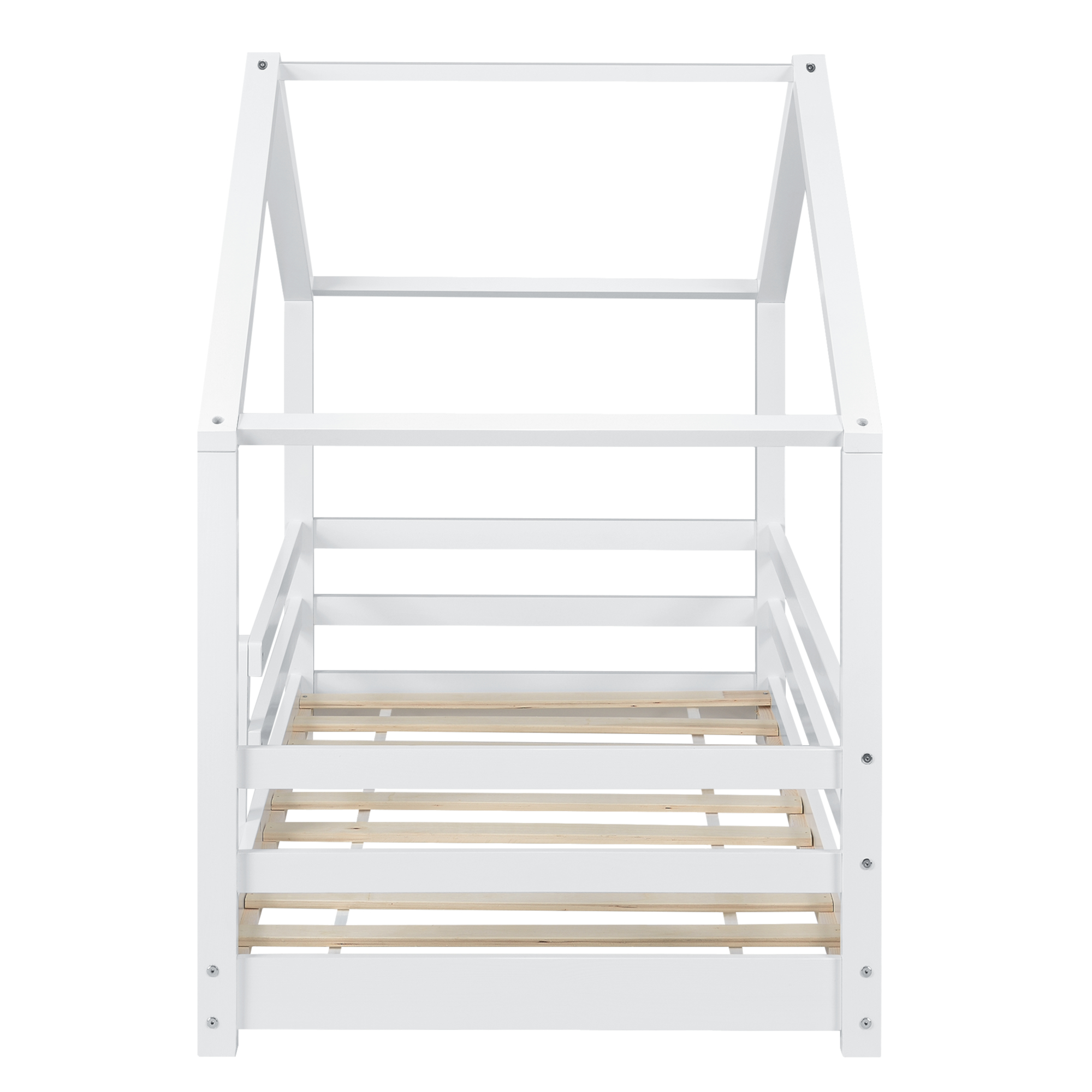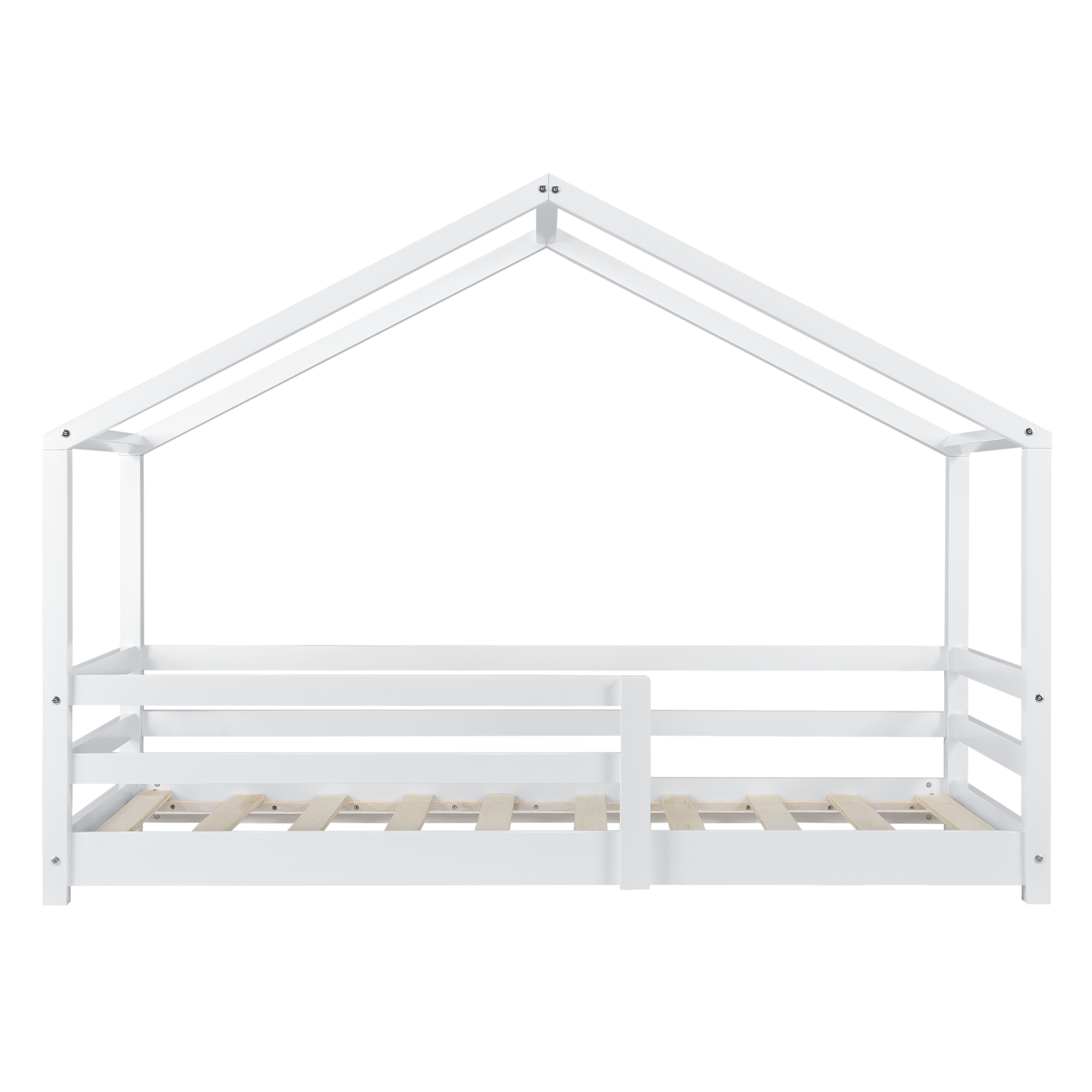Pat copii tip căsuță 90x200 cm alb din lemn de pin, cu protecție