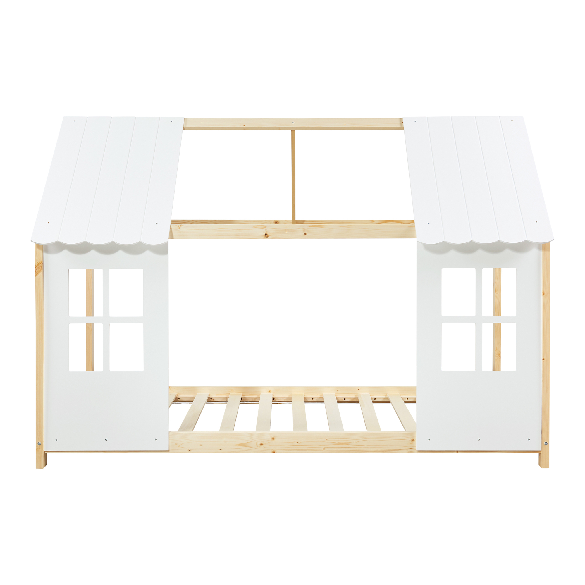 Patul pentru copii tip căsuță Tostedt transformă camera celui mic într-un spațiu cald, jucăuș și primitor. Realizat din lemn de pin în combinație naturală cu alb, acest pat copii 90x200 are un design semideschis care încurajează imaginația și oferă un loc confortabil pentru somn, joacă și relaxare.