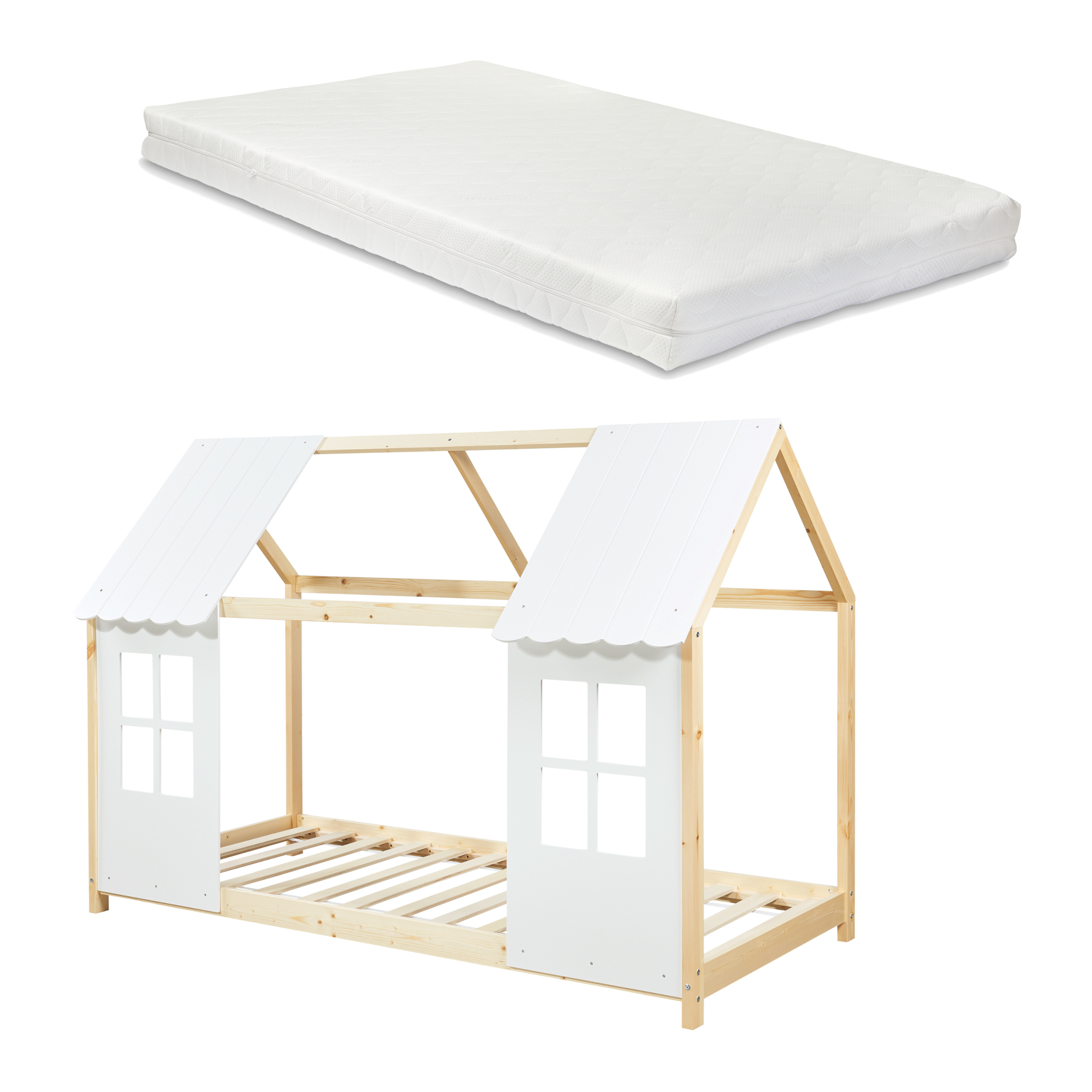Pat copii tip căsuță Tostedt cu saltea 90x200 cm, lemn și alb