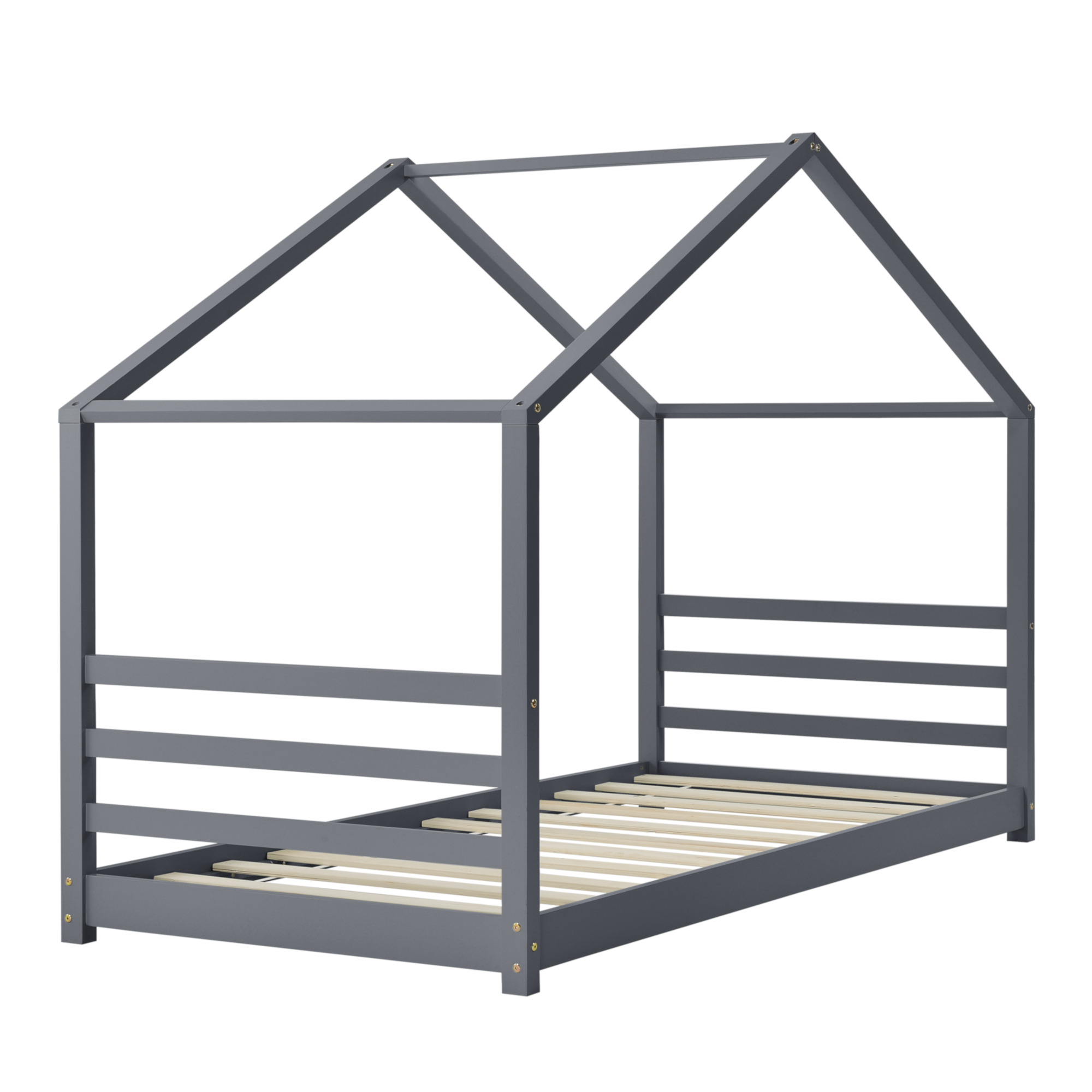 Pat copii tip căsuță Vardø 90x200 cm este alegerea ideală pentru o cameră de copil modernă, practică și primitoare. Realizat din lemn de pin, acest pat copii 90x200 oferă un loc confortabil pentru odihnă, iar designul în formă de casă transformă spațiul de dormit într-un colț plin de farmec. Finisajul gri închis mat se integrează ușor în diferite stiluri de amenajare.