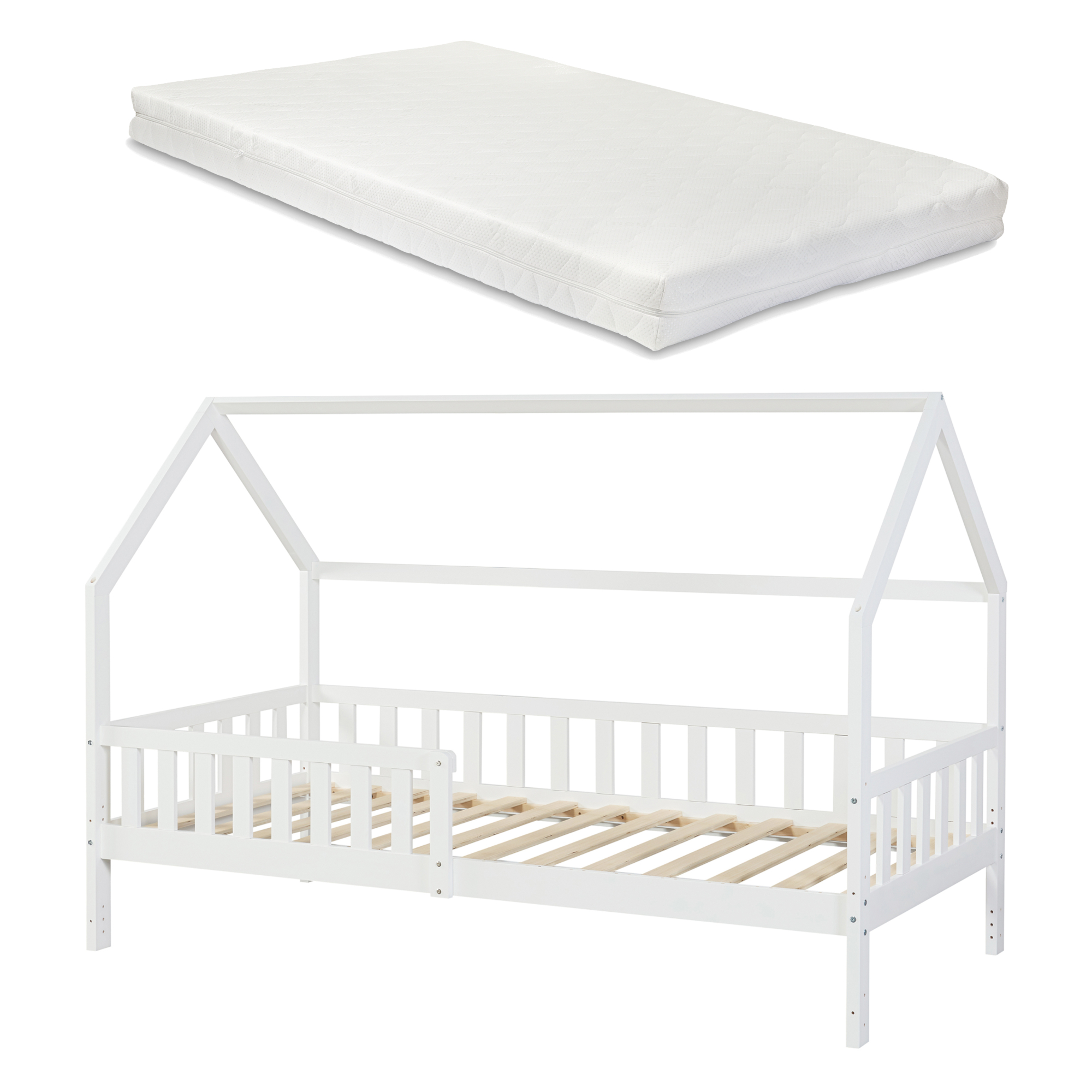 Pat copii tip căsuță Ydre 90x200 cm cu saltea, alb, lemn de pin