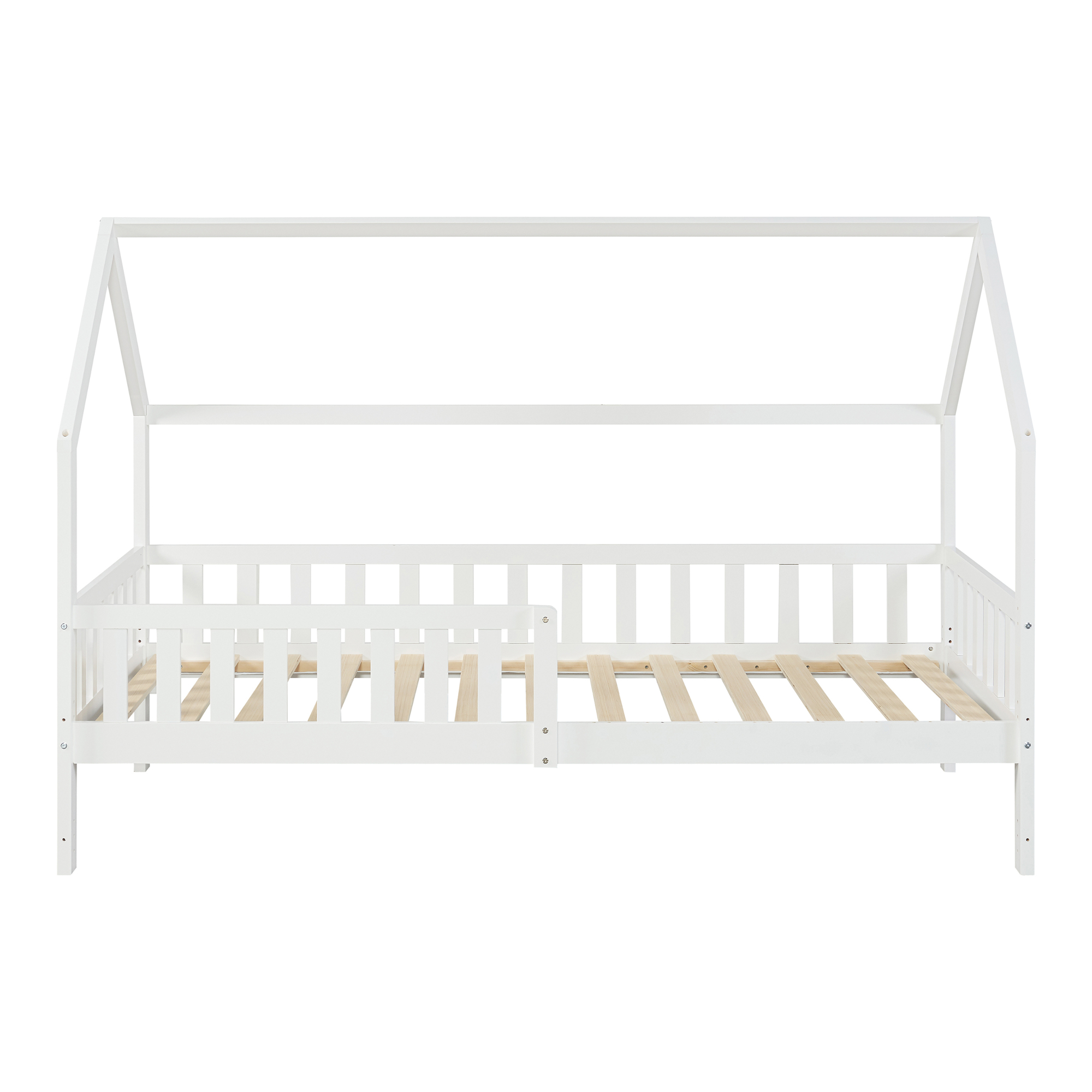 Pat copii tip căsuță 90x200 cm, realizat din lemn de pin alb, cu saltea inclusă și laterale de protecție anti-cădere. O alegere practică și elegantă pentru un somn sigur și confortabil, cu montaj flexibil și design decorativ potrivit pentru camera fetelor sau băieților.