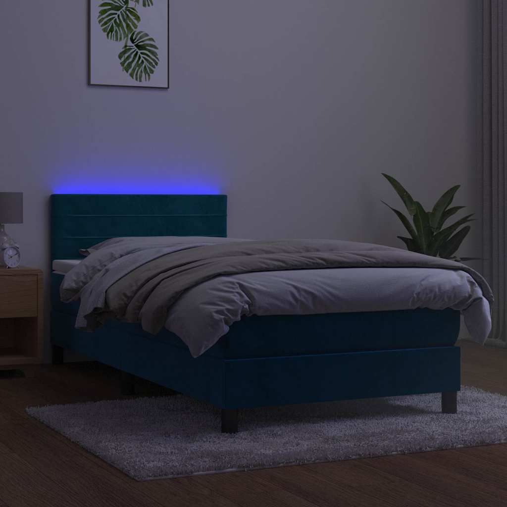 Pat cu arcuri, saltea și LED, bleumarin, 90x190 cm, catifea GartenMobel Dekor