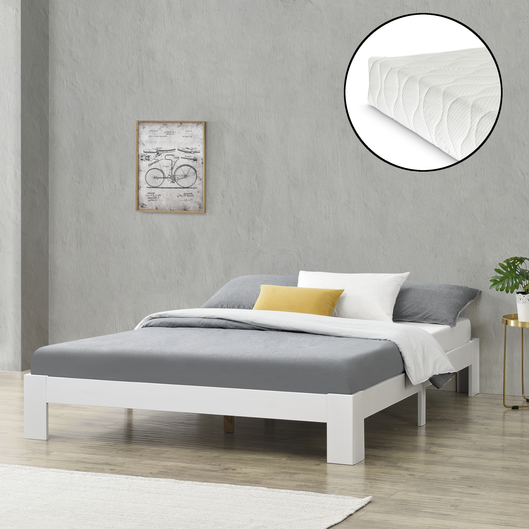 Pat din lemn Raisio 140x200 cm alb cu saltea din spuma rece
